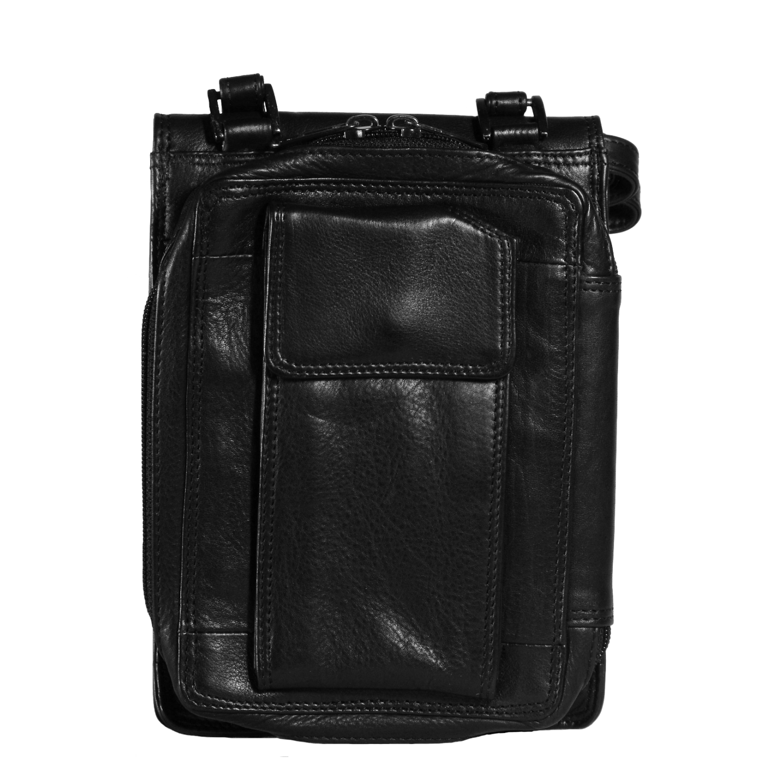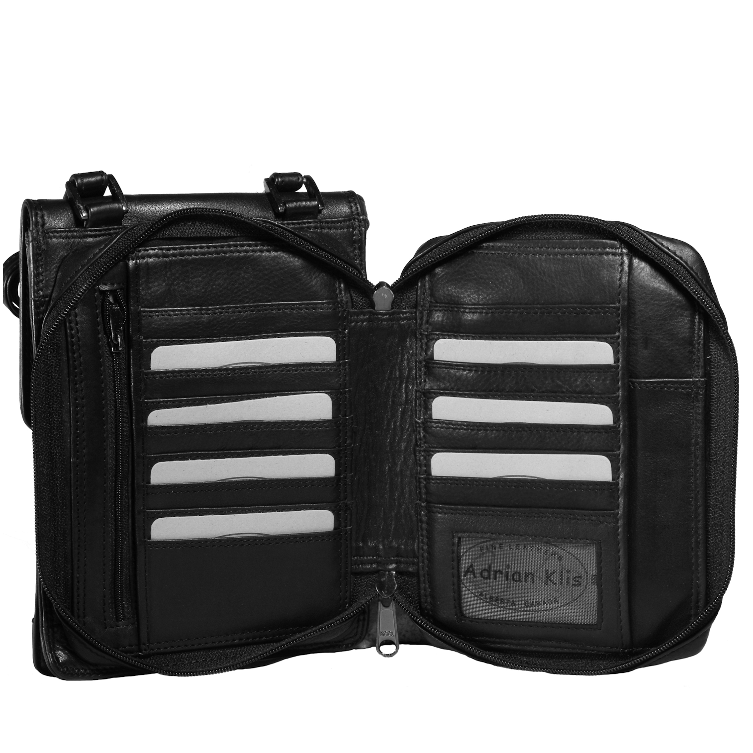 1 zipper inside, zipper around, cell pocket on back, 2 main pockets on front and organizer on back