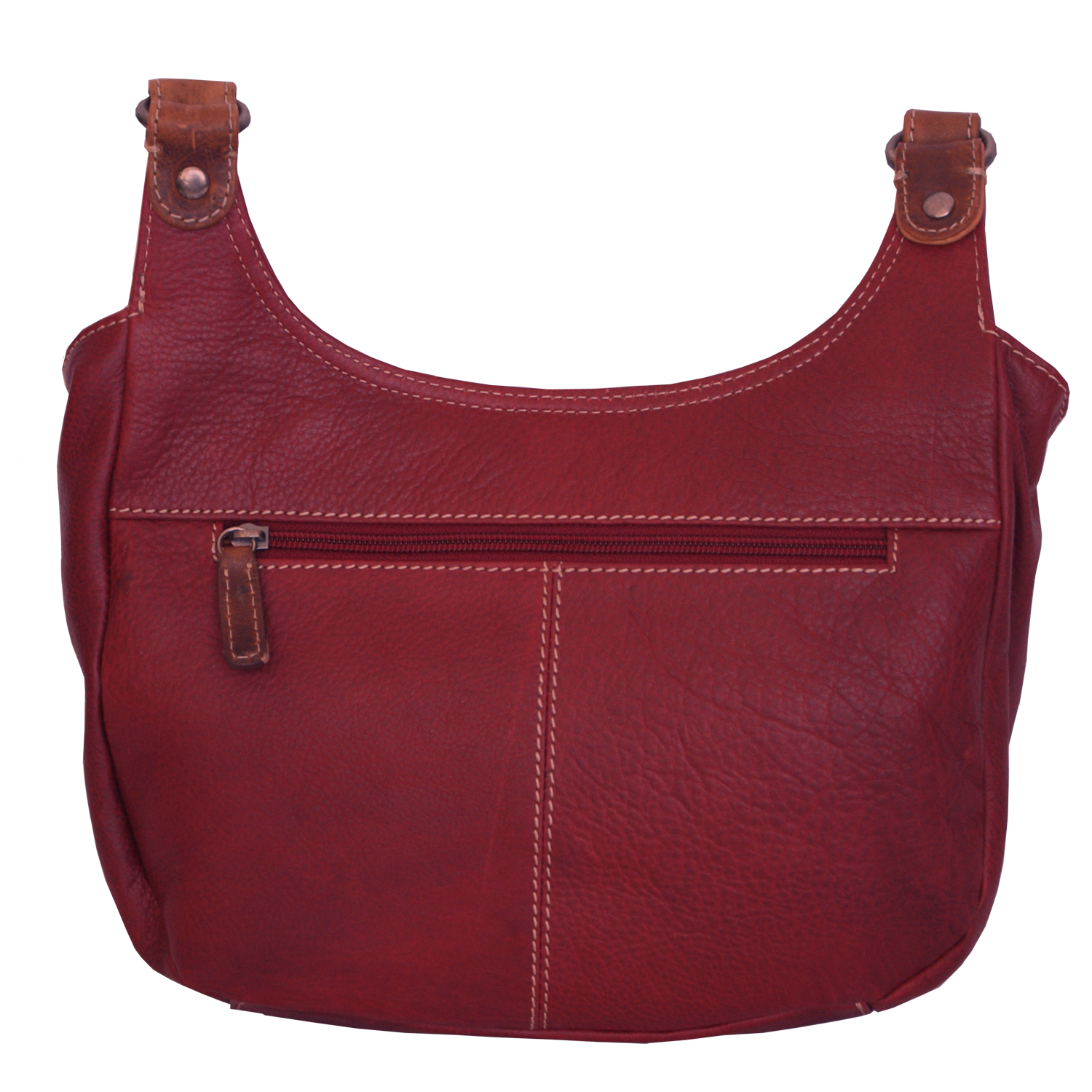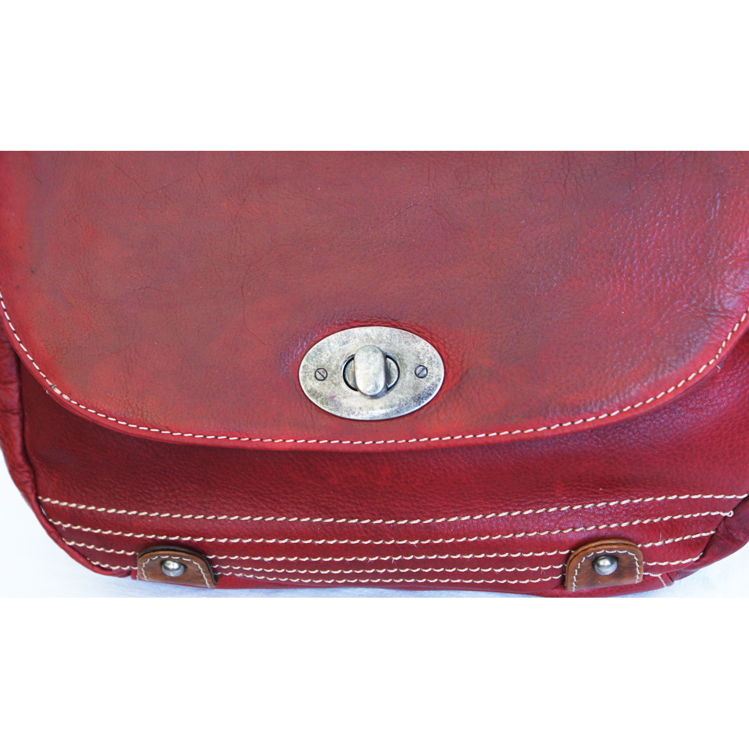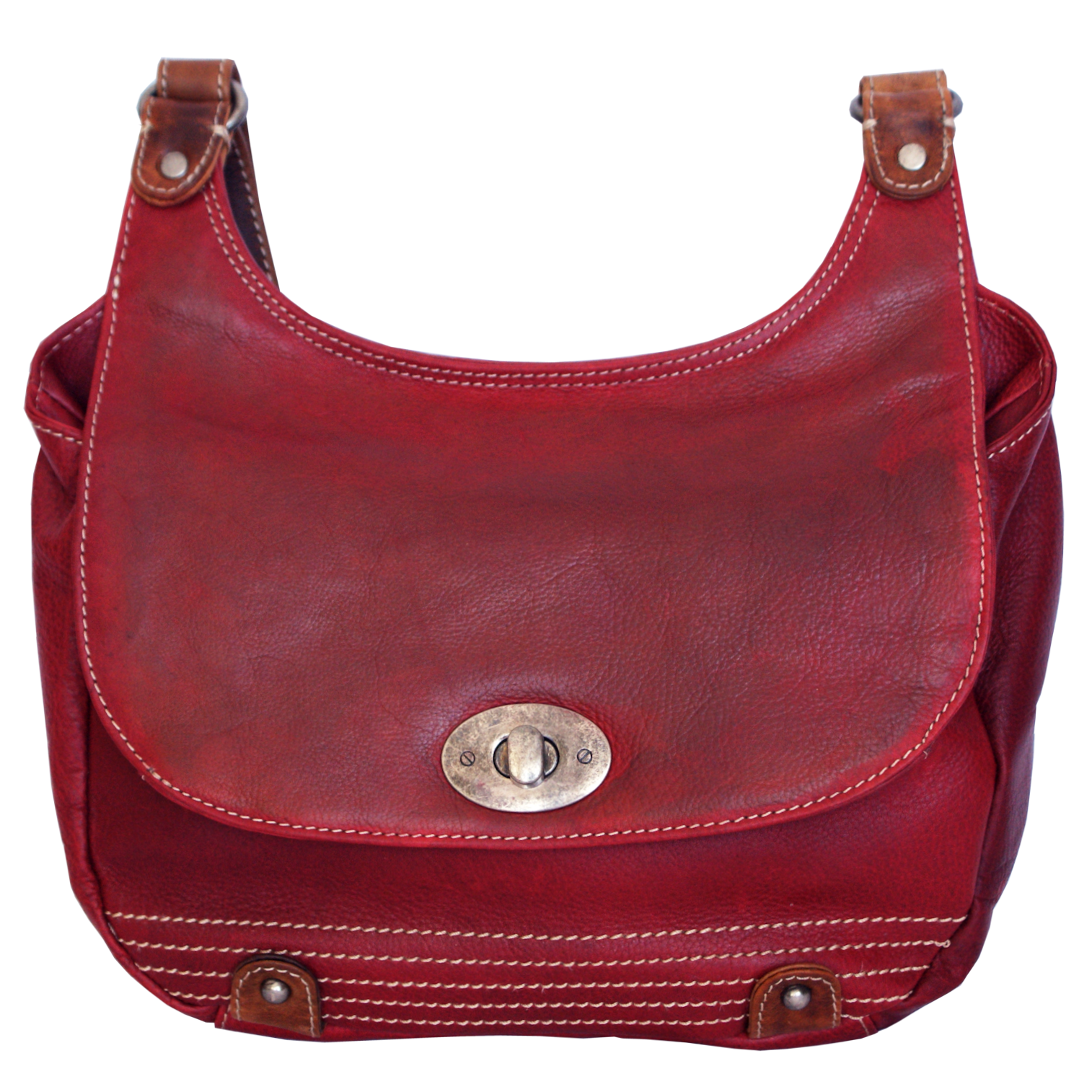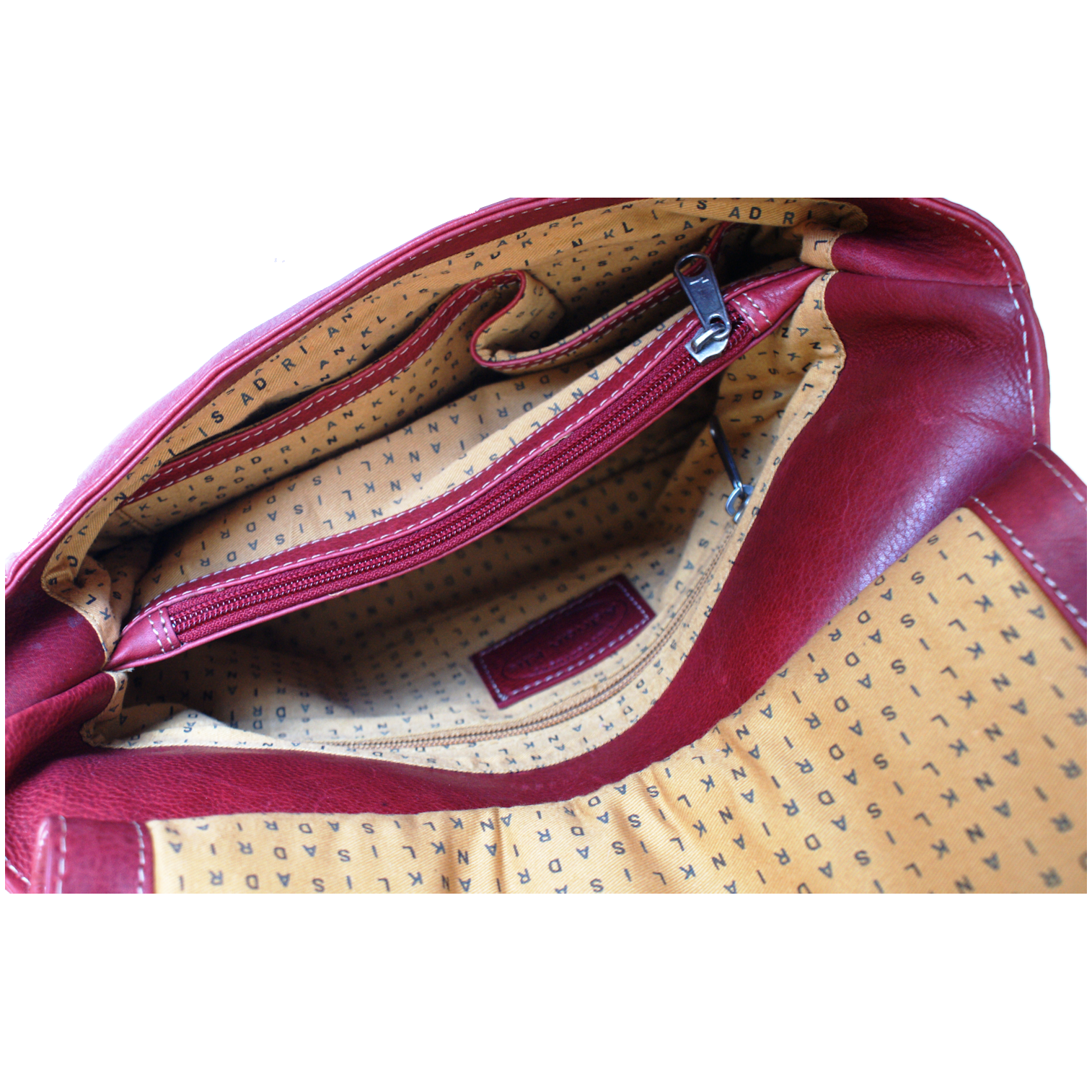 Description: | 1 adjustable shoulder strap in brown color Bag is closed with a silver colored lock Back: 1 pocket closed with zipper Inside: 3 compartments Comp. I inside: open with 2 open pockets Comp. II: closed with zipper Comp. III inside: open with 1 pocket closed with zipper Bag is also available in blue color and in distressed leather |