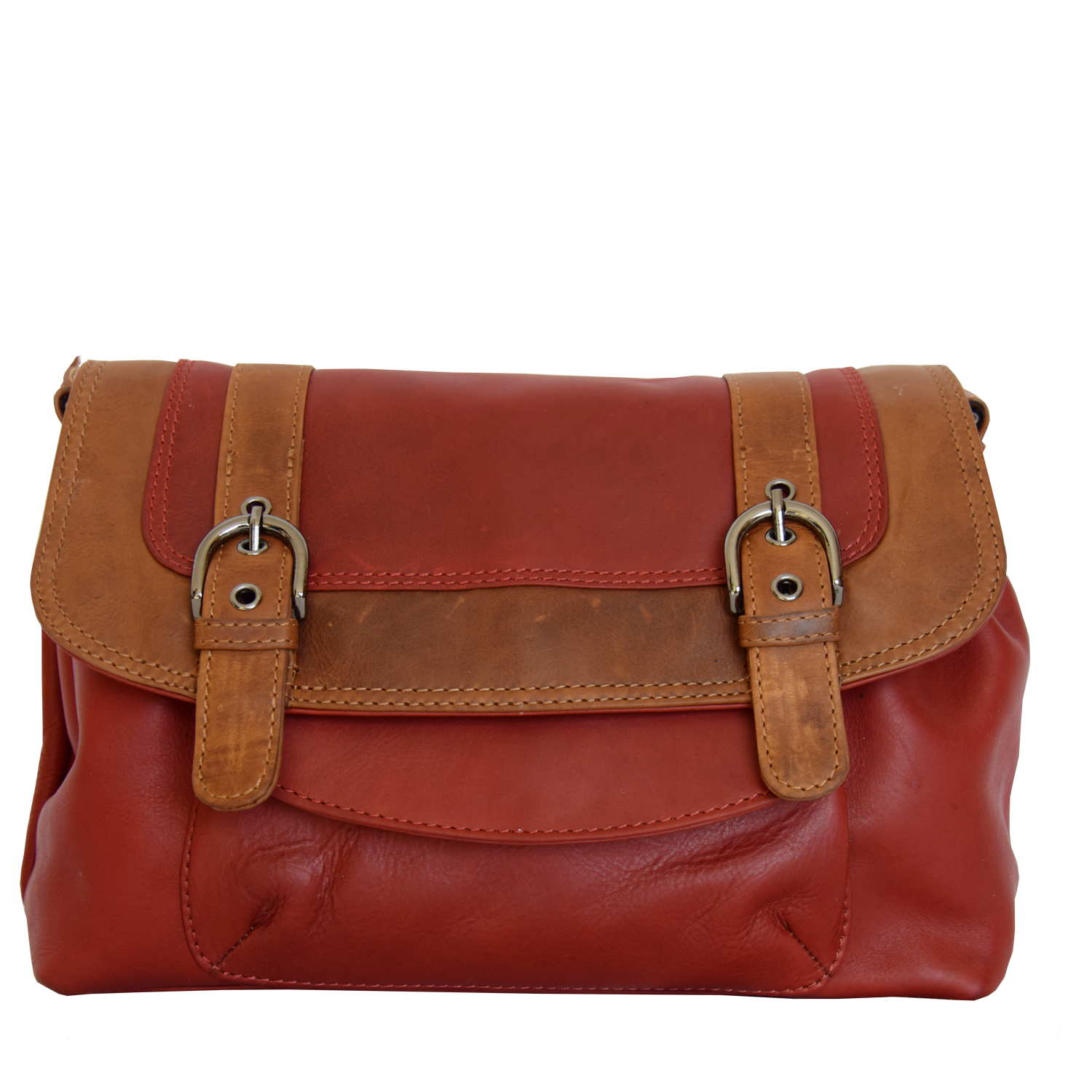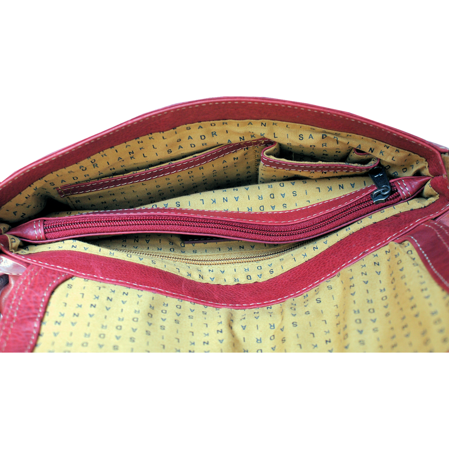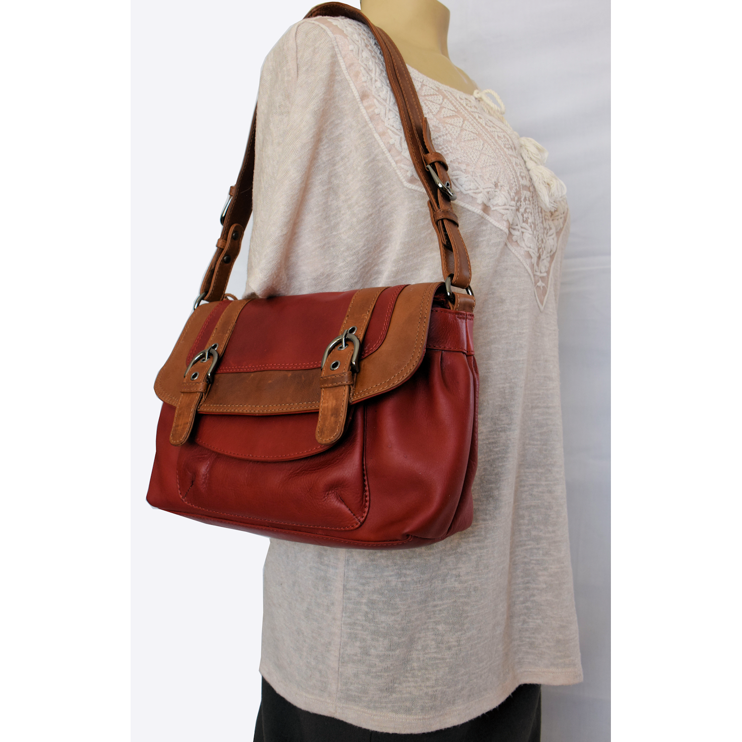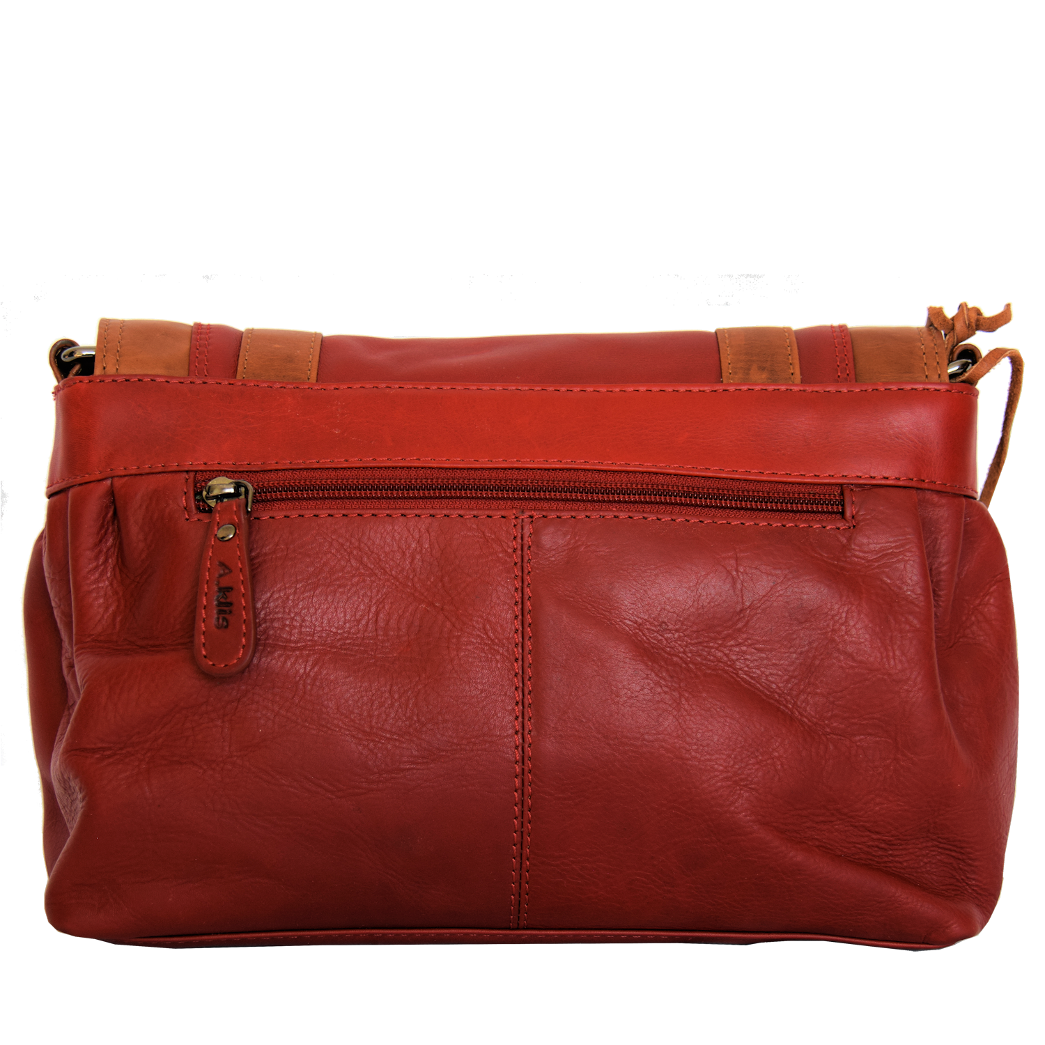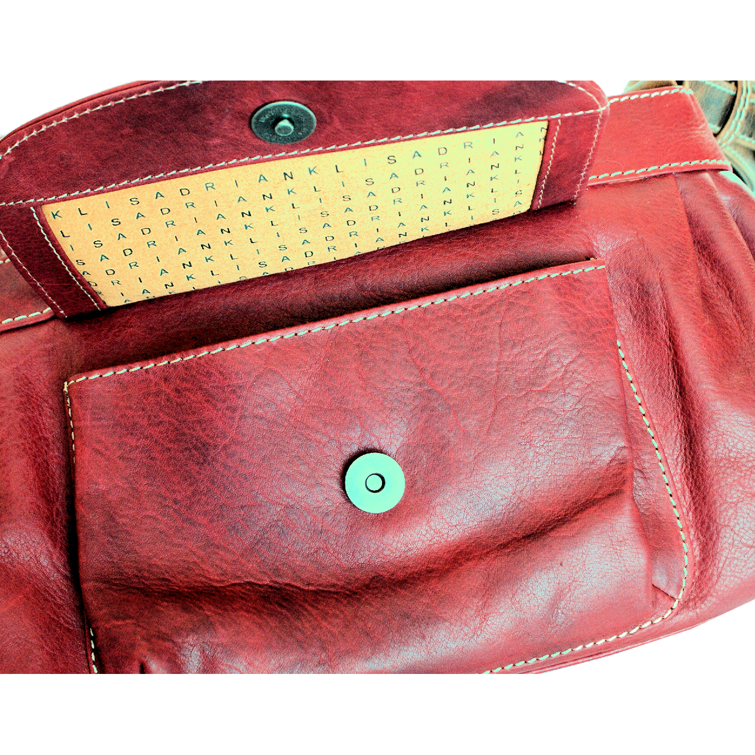 Description: | 1 adjustable removable handle, 1 removable adjustable shoulder strap in brown color Bag is closed with 2 magnetic snaps Front inside: 1 pocket closed with magnetic snap Back: 1 pocket closed with zipper Inside: 3 compartments Comp. I inside: open with 2 open pockets Comp. II: closed with zipper Comp. III inside: open with 1 pocket closed with zipper Bag is also available in blue color and in distressed leather |