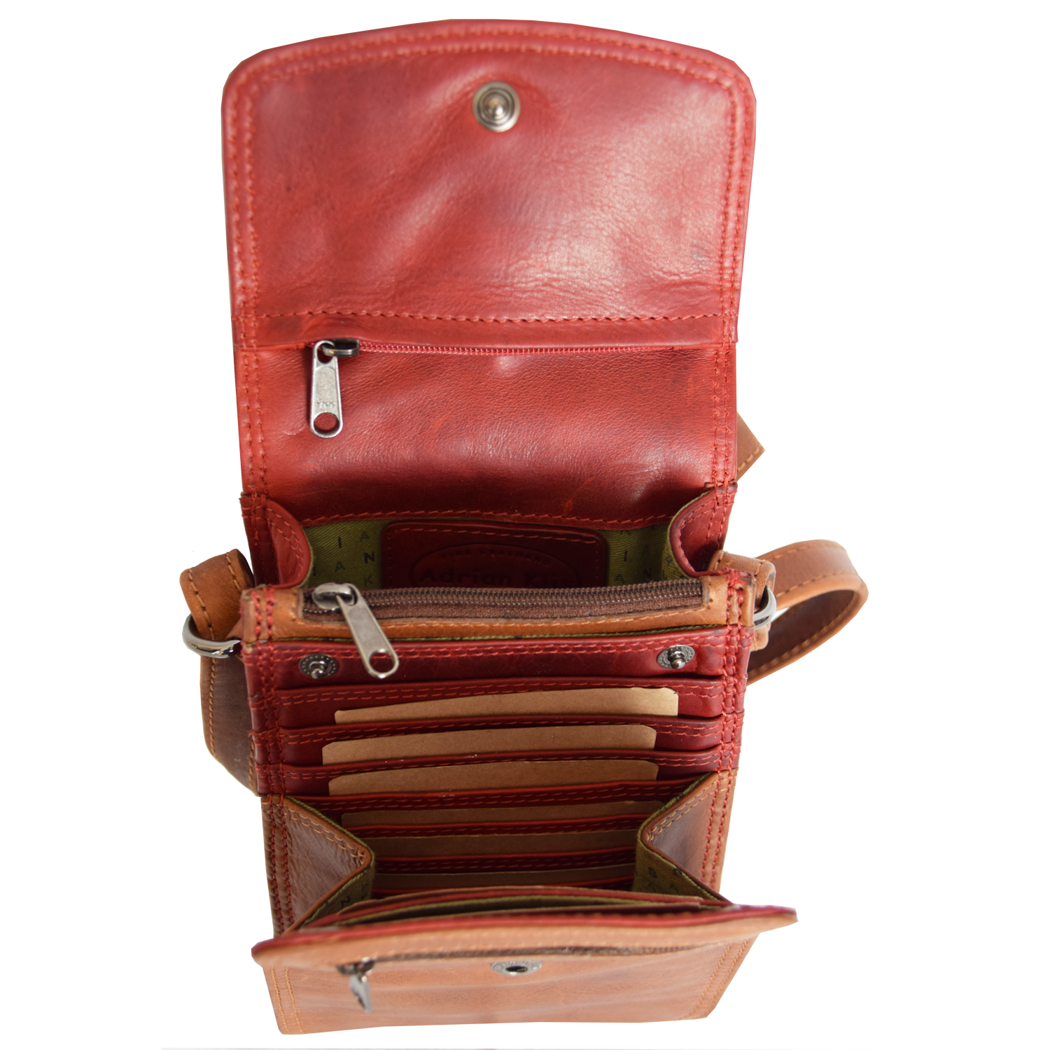 Inside: organizer with 16 CC slots, closed with 2 snaps, 1 open pocket, 1 pocket closed with zipper