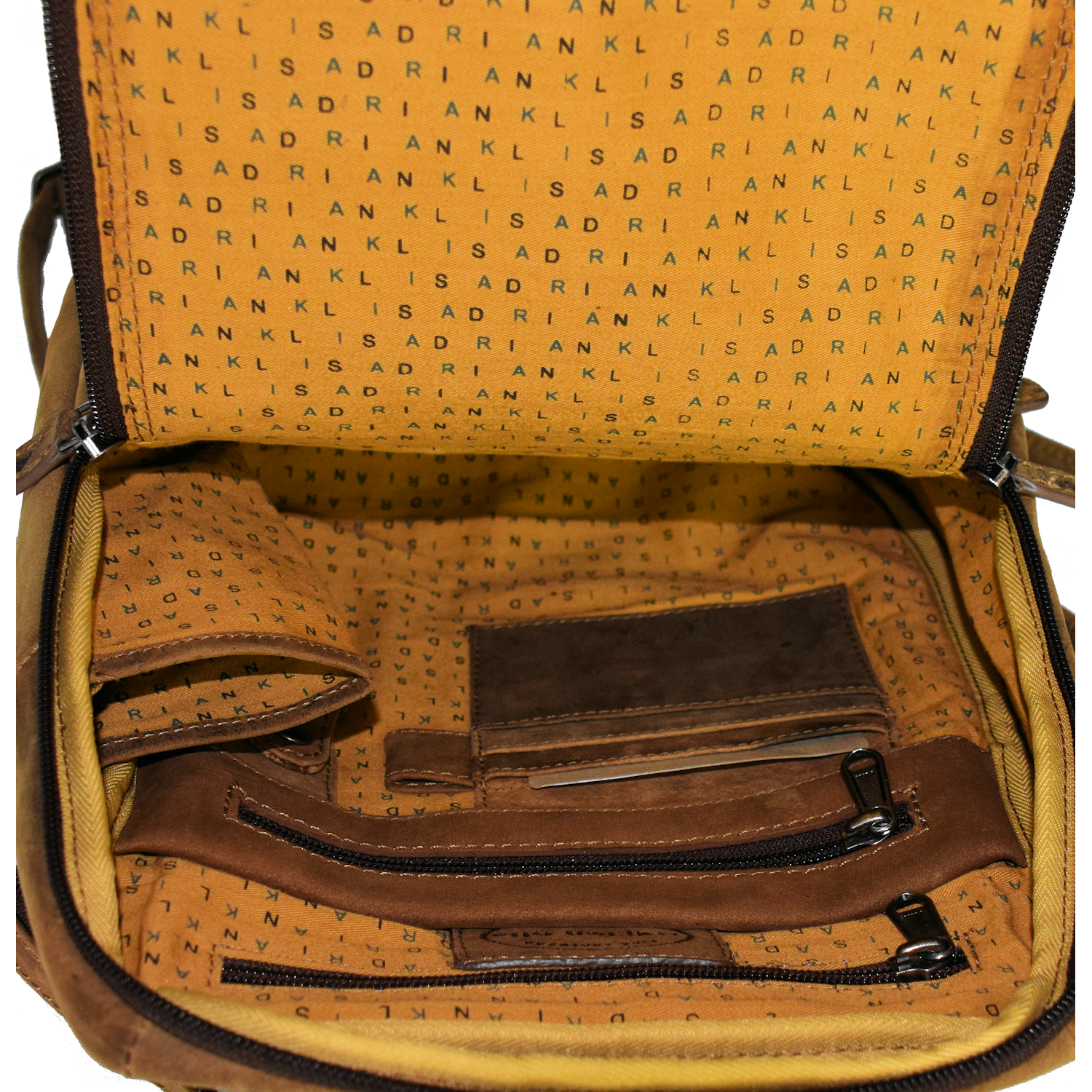 Bag is closed with zipper, 1 handle, 1 dividable shoulder strap, 1 zipper on back, 1 zipper on side, 2 zippers on front, main pocket has organizer with CC slots and 2 inside zippers. |