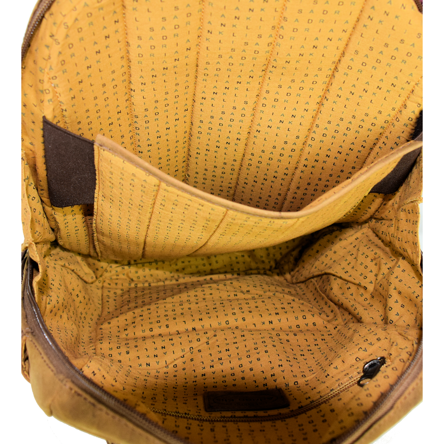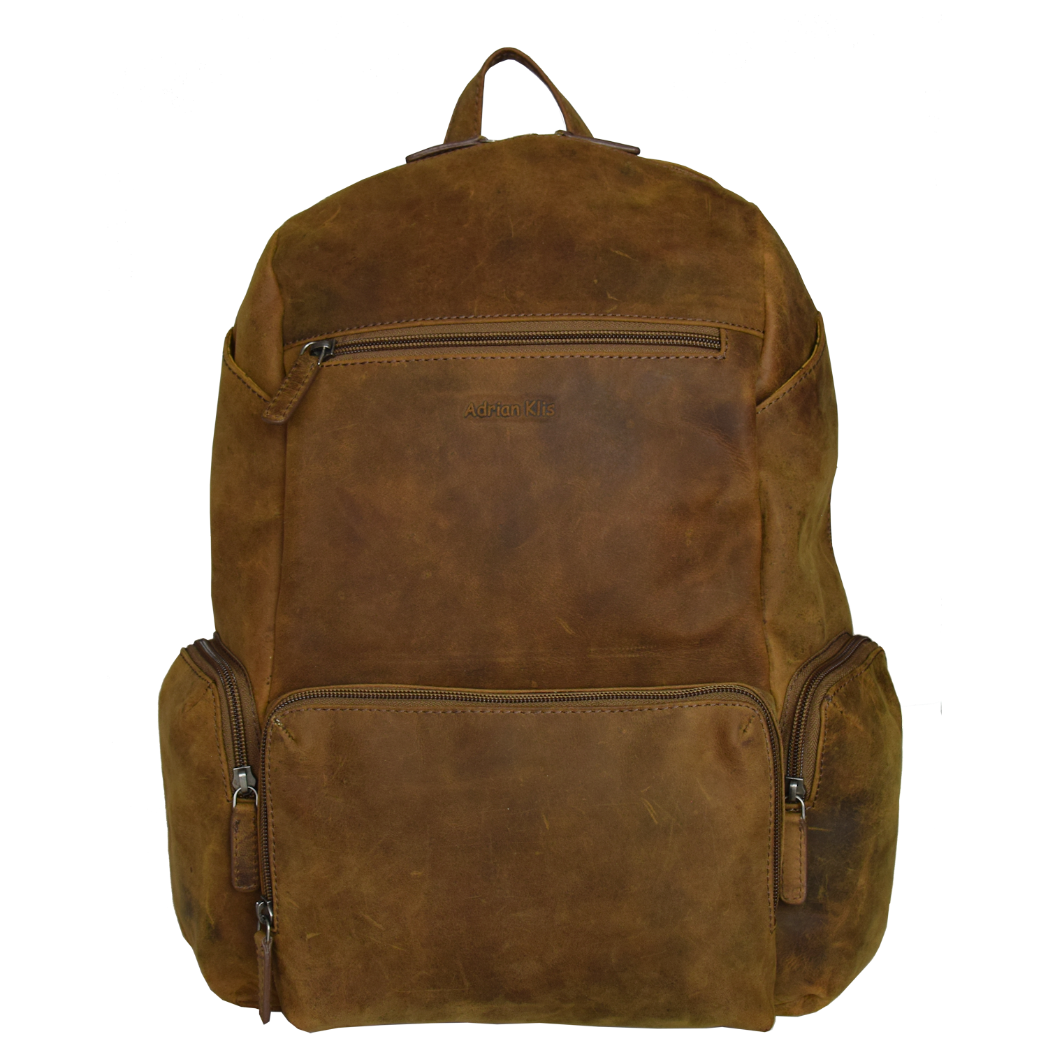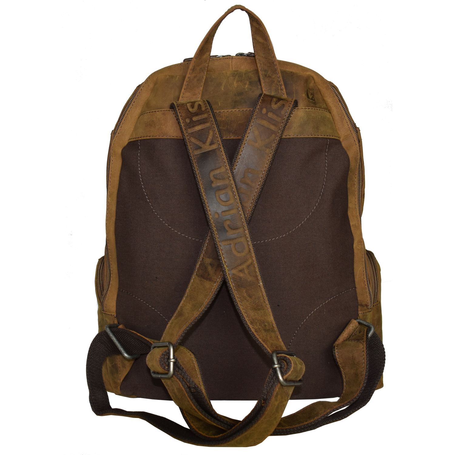1 handle Front: 2 pockets closed with zipper Front pocket: inside: 2 open pockets 2 side pockets closed with zipper Back: 2 adjustable shoulder straps padded with canvas outside 1 main compartment closed with zipper inside: 1 pocket closed with zipper, 1 pockets padded for laptop |