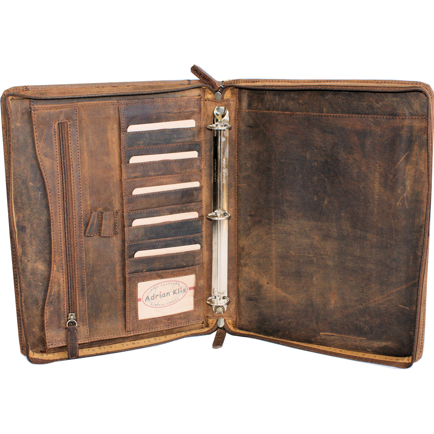 Inside: 3 rings for binding (optional), 3 large open pockets, 1 pocket closed with zipper, 2 pen holder, 9 CC, 1 ID