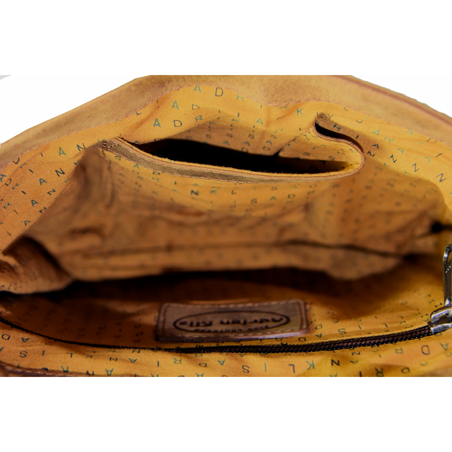This bag fits your iPad and has adjustable shoulder strap, bag closed with 2 magnetic snaps. Front: 1 open pocket under flap Back: 1 pocket closed with zipper Main Compartment: 1 open pocket inside, 1 pocket closed with zipper, 1 key holder, 1 pen holder |