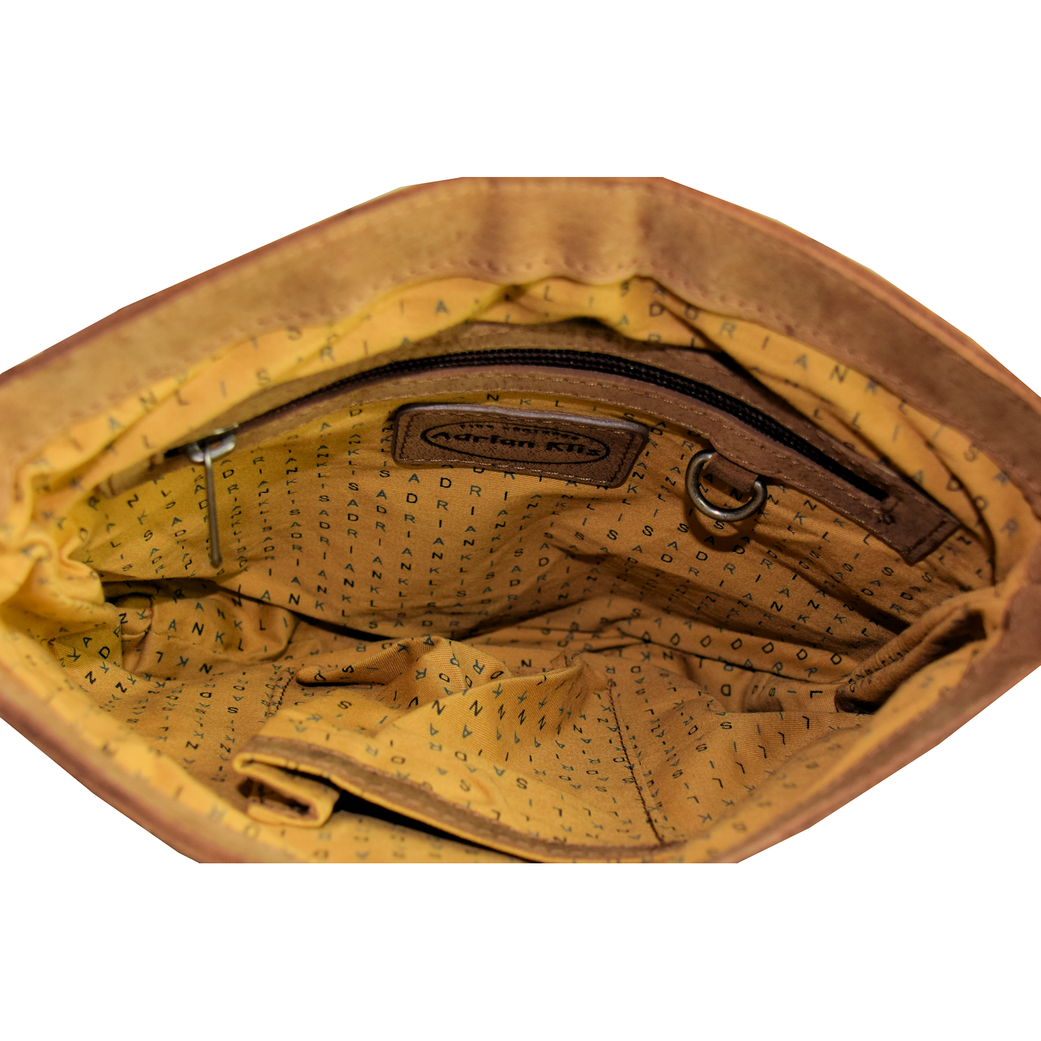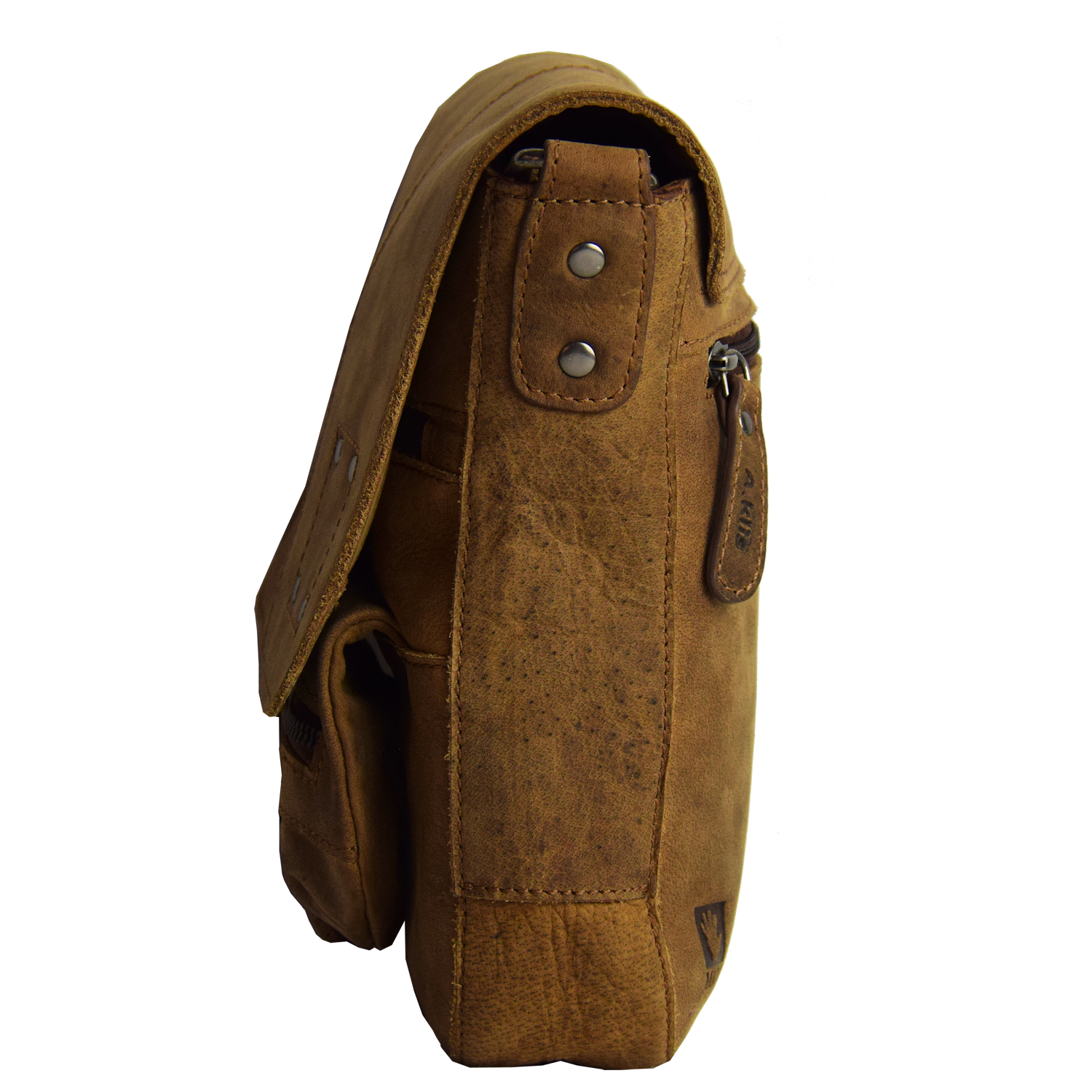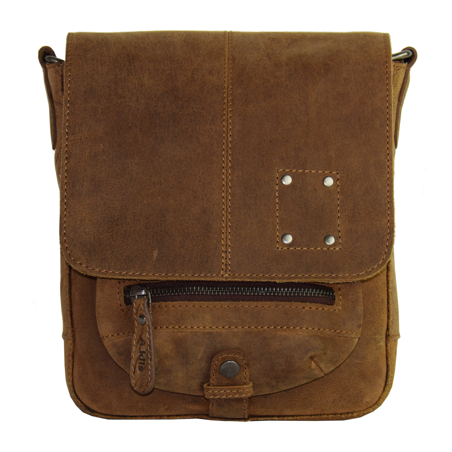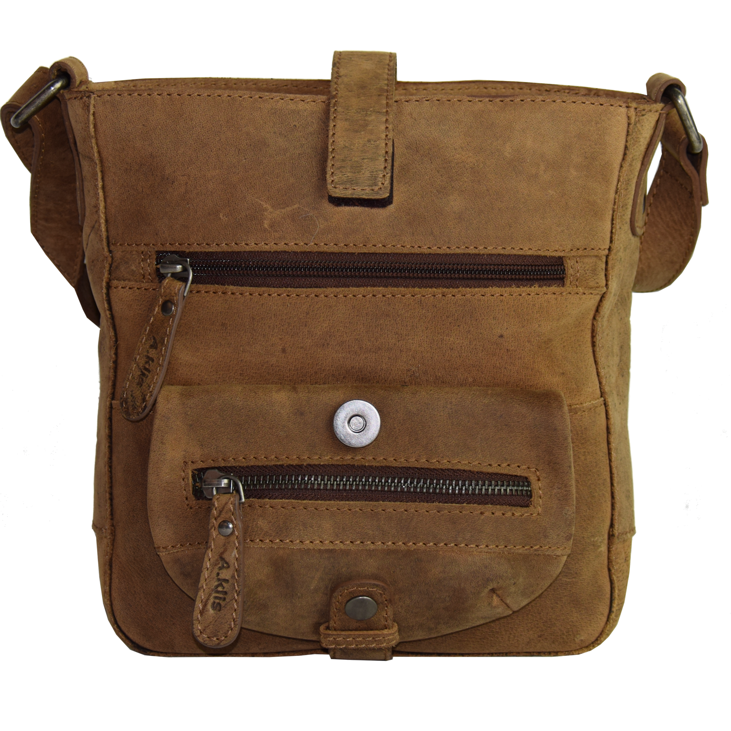 adjustable shoulder strap, bag closed with snap Front: 1 pocket under flap, 1 pocket closed with zipper, 1 pouch closed with snap and 1 pocket with zipper on front Back: 1 pocket closed with zipper Main Compartment inside: 1 open pocket, 1 cell phone pocket |