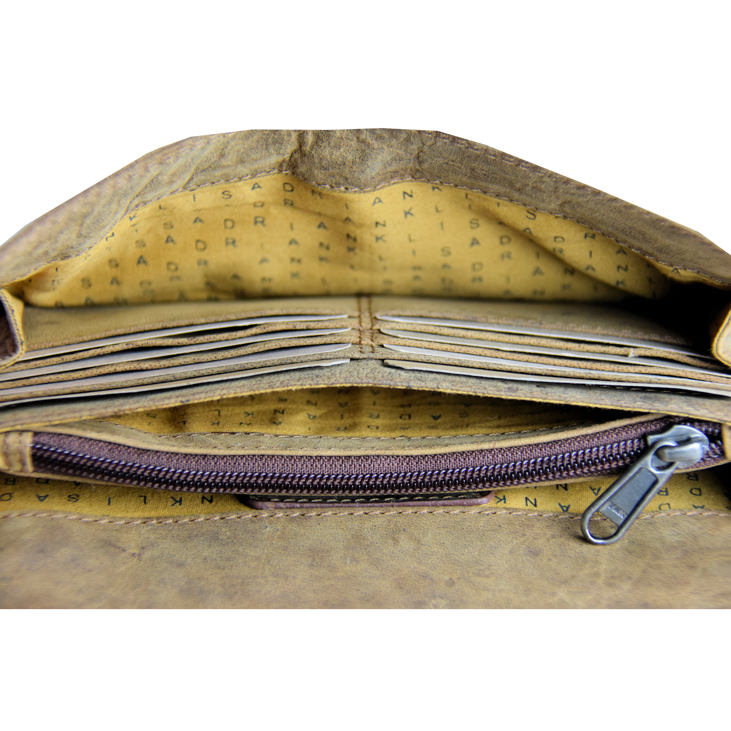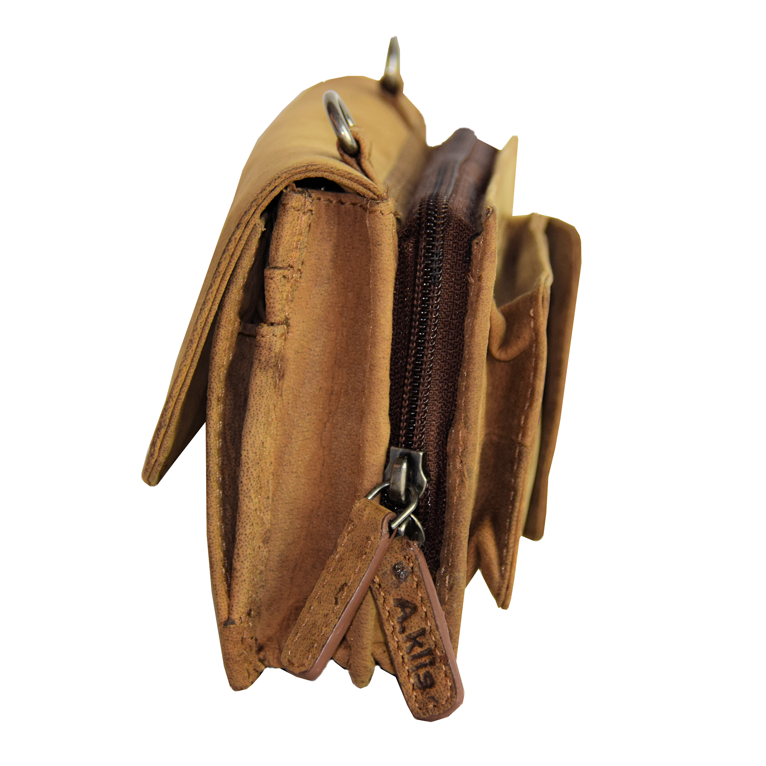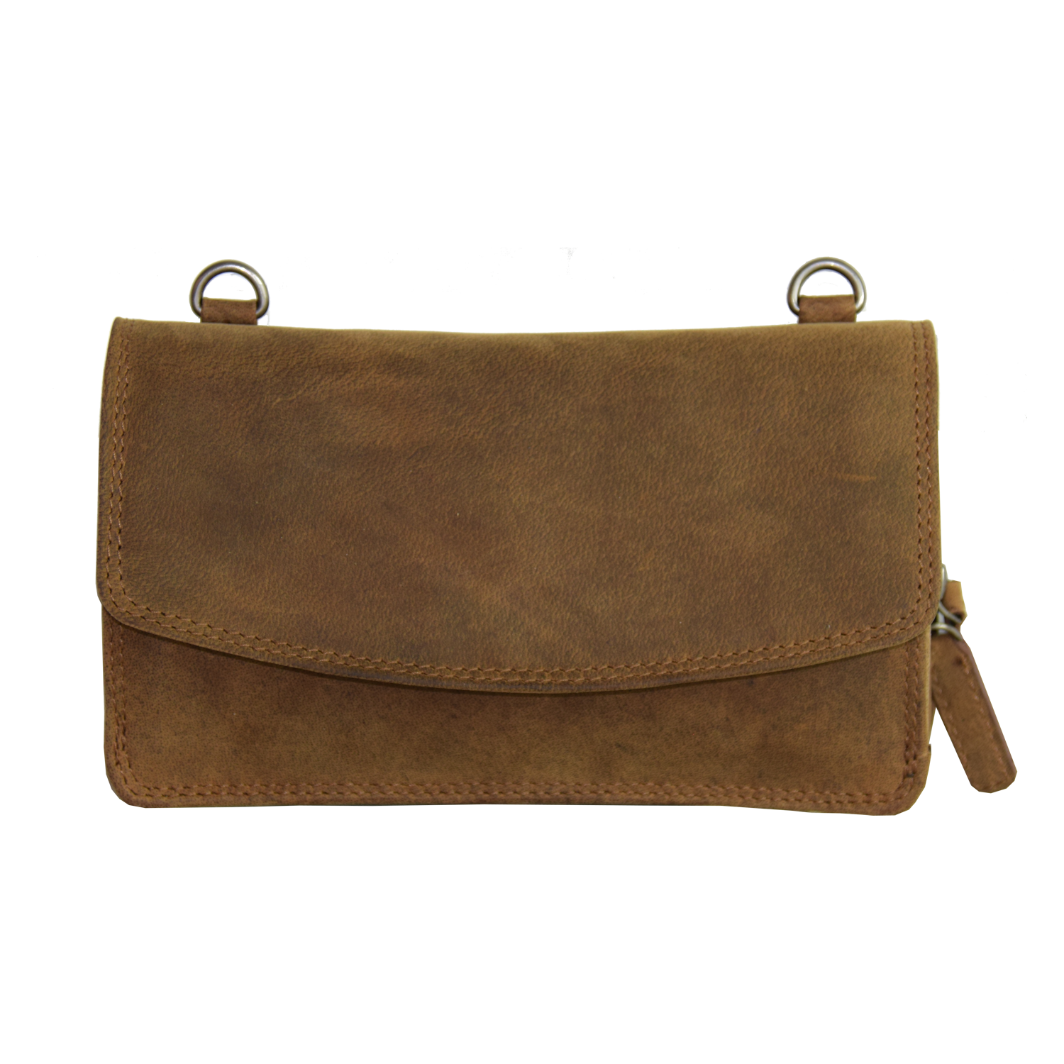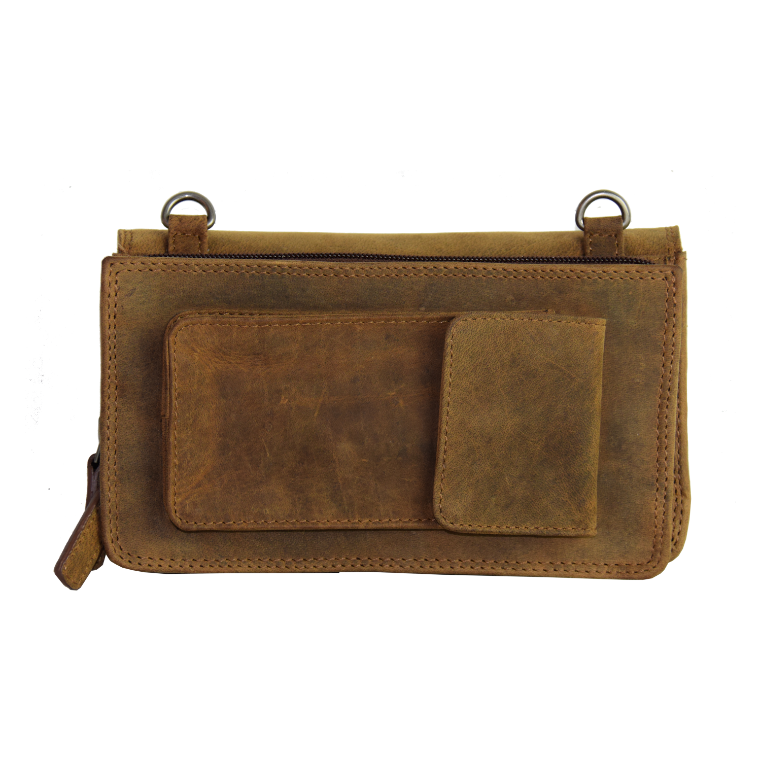 Organizer is closed with flap and snap Adjustable removable shoulder strap Back: 1 cell phone pocket closed with flap and snap 2 Compartments: Comp. I: closed with zipper, inside 12 CC slots Comp. II: 8 CC slots, 1 pocket closed with zipper, 2 open pockets
