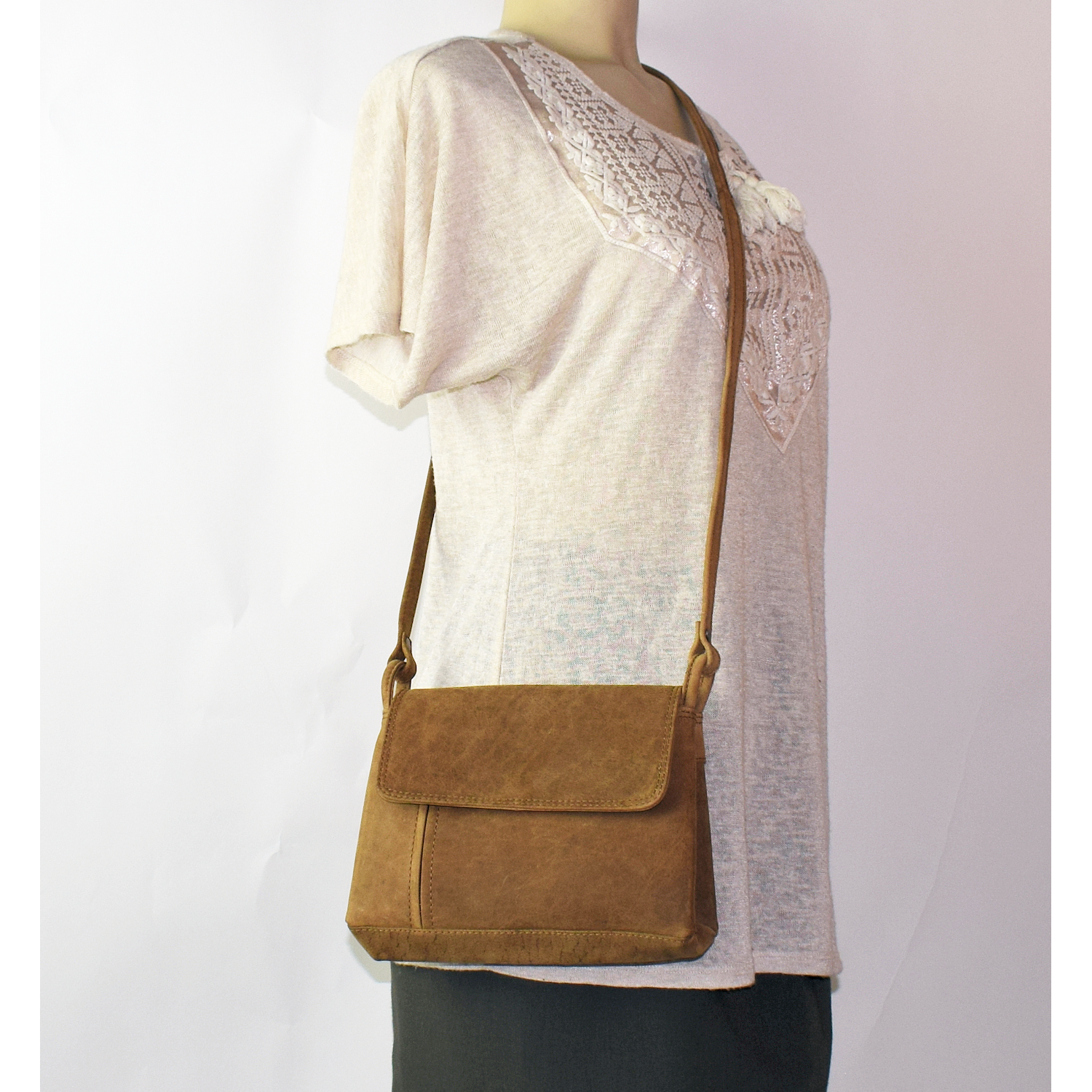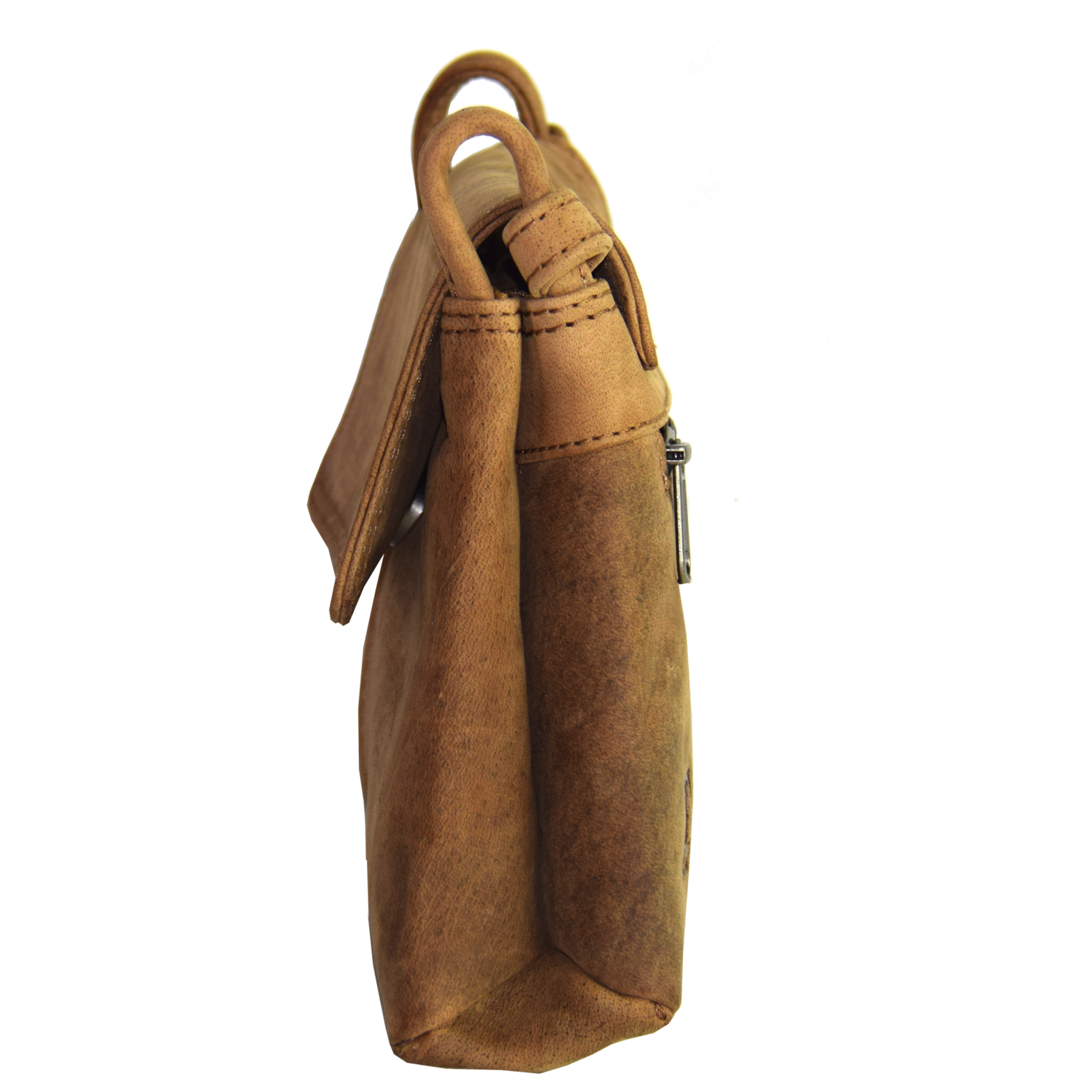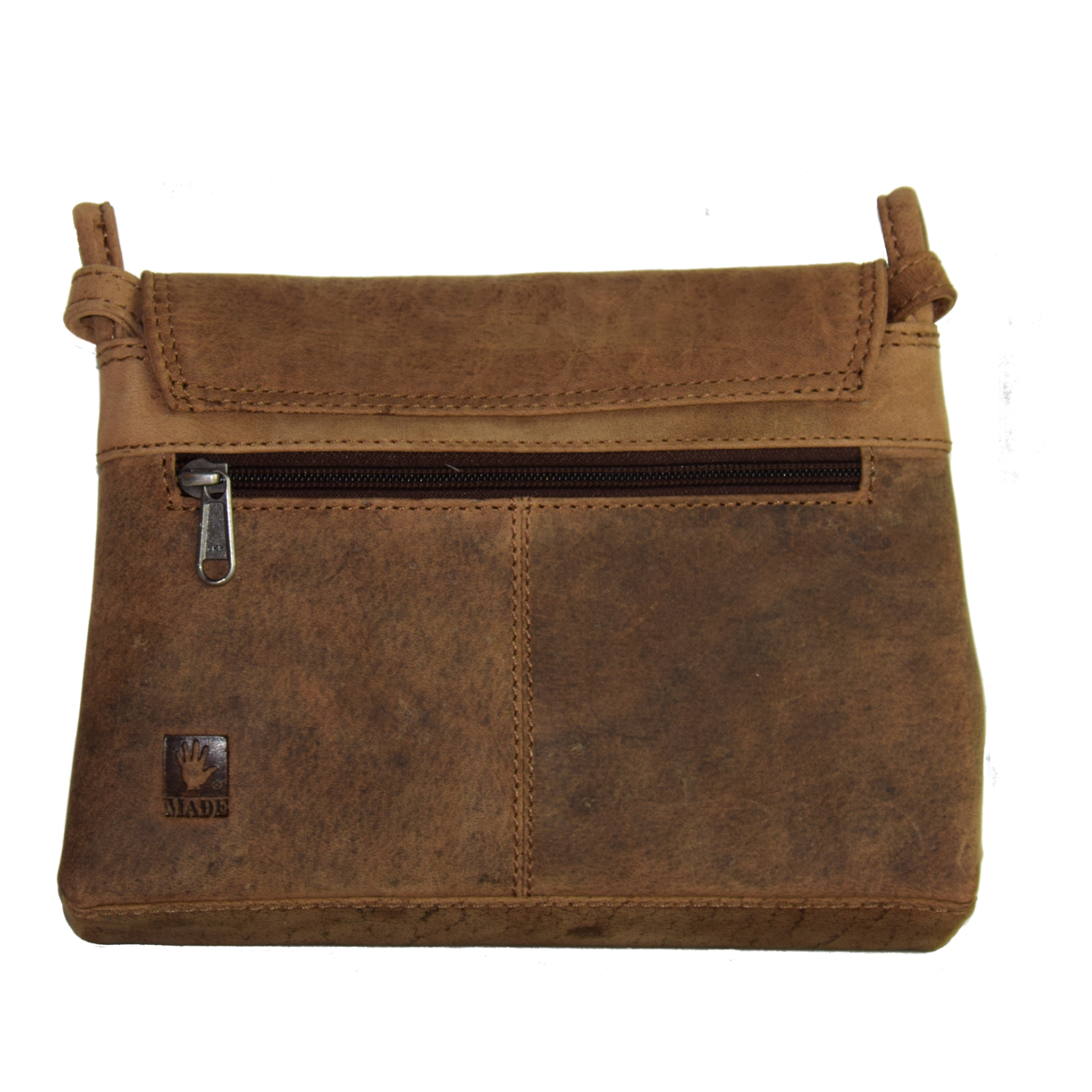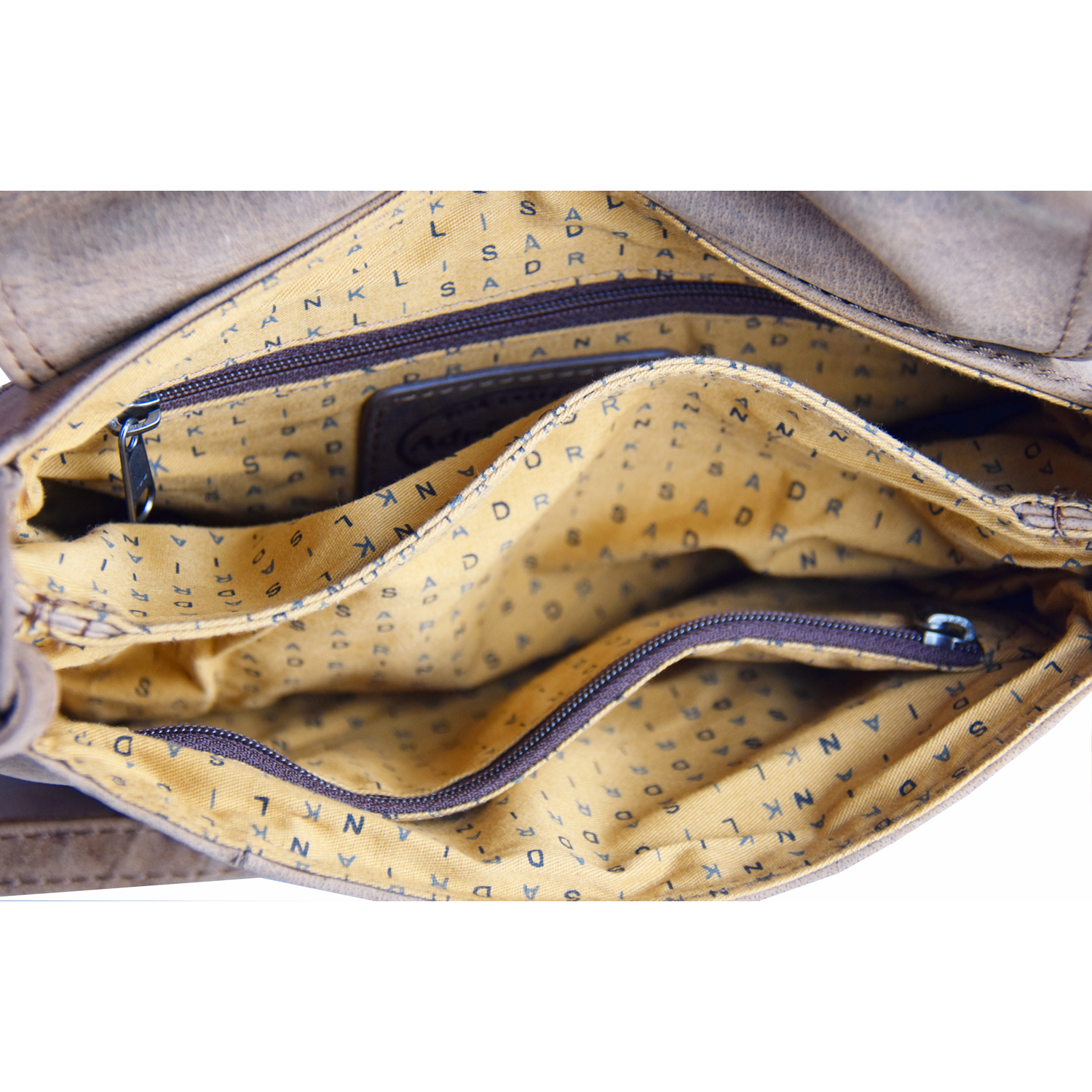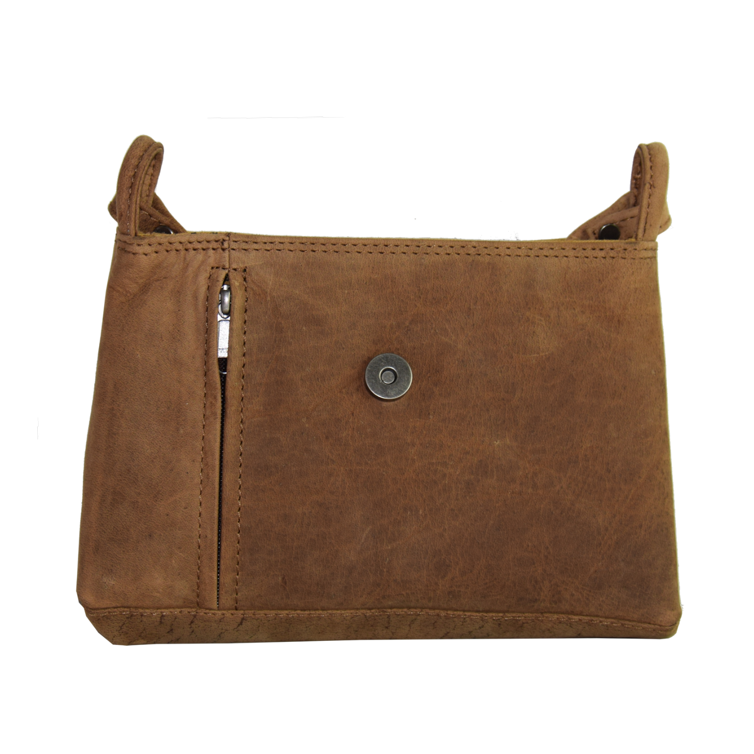 Purse is closed with snap, 3 pockets, 2 zippers outside and 2 zippers inside, adjustable straps |