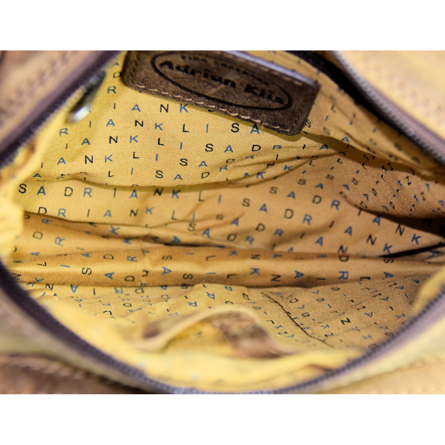 Inside: 1 cell phone pocket, 1 open pocket, 1 pocket closed with zipper, 3 pen holder