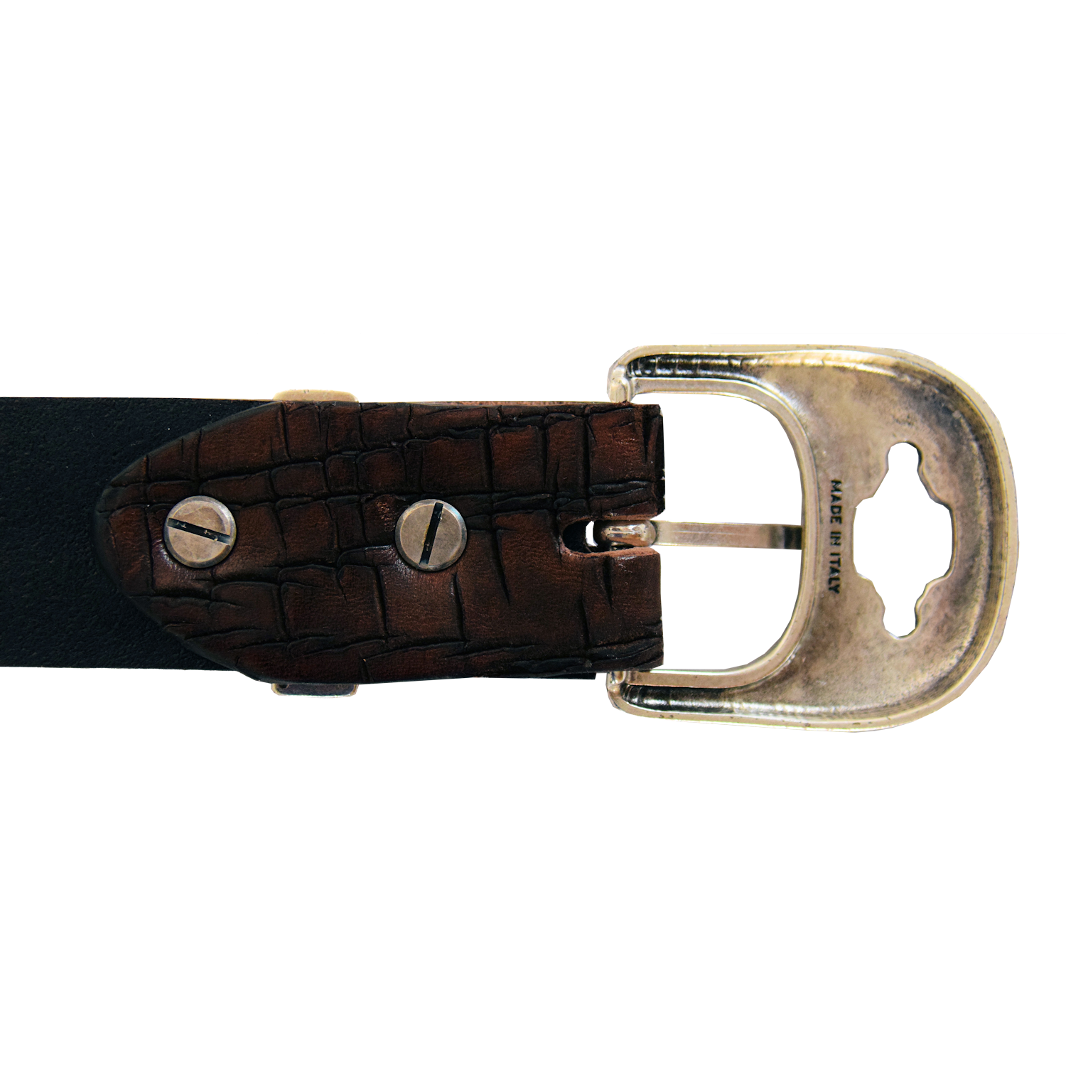 • Complimented with a silver coloured ornament buckle, removable by screw system and silver colored end piece.