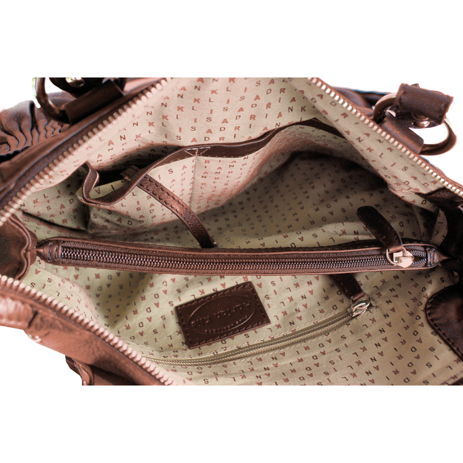 Inside: 2 large open compartments, 1 large compartment closed with zipper