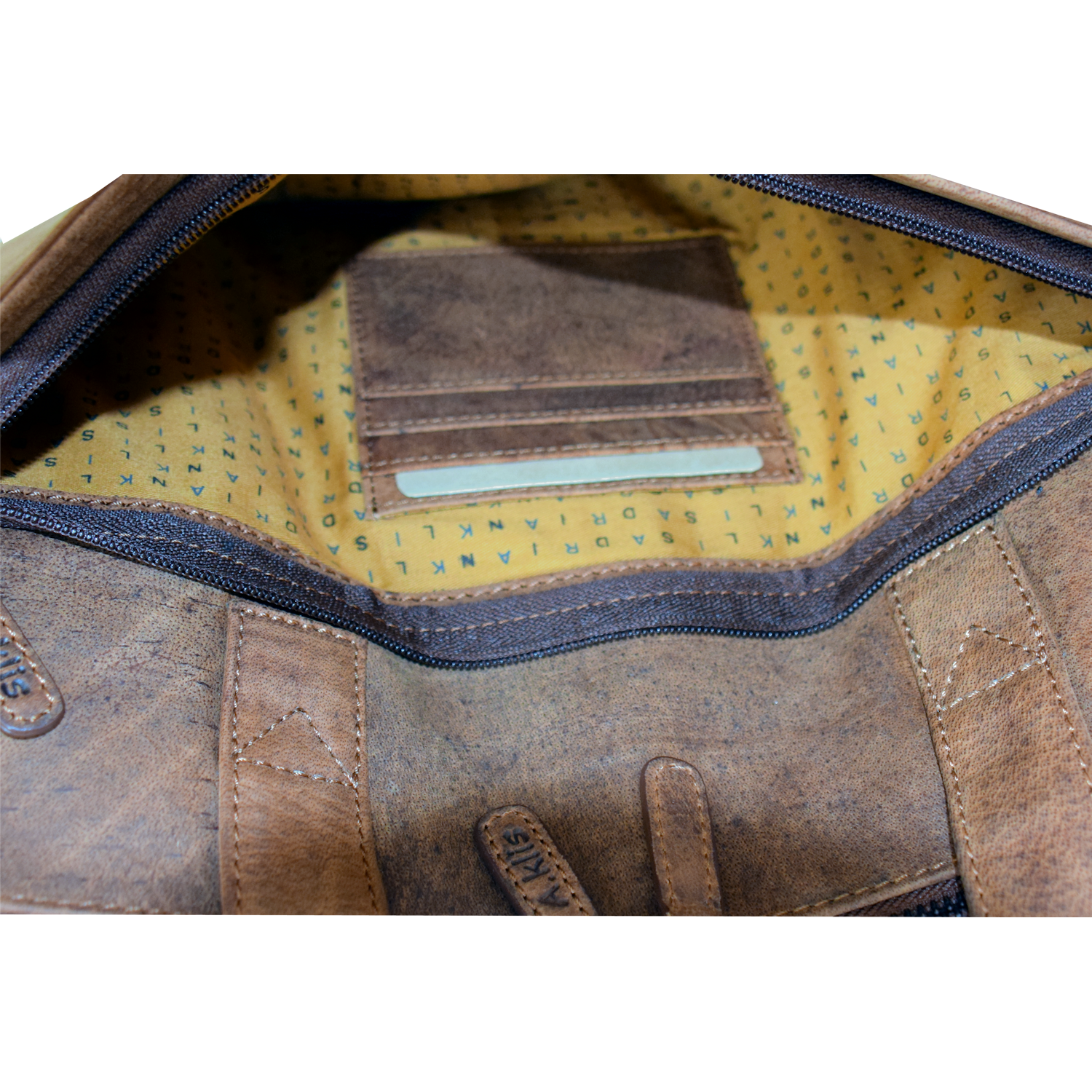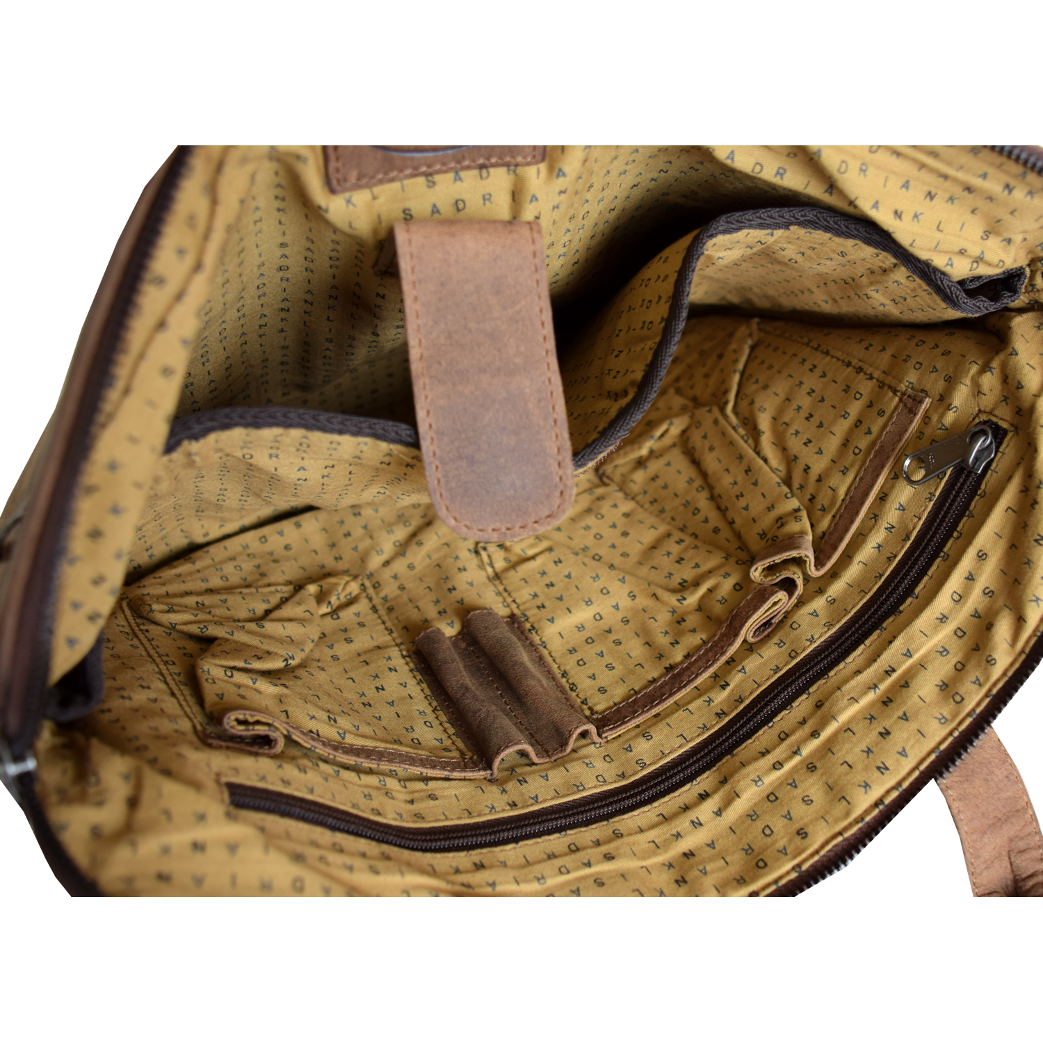 Briefcase is closed with zipper, 1 handle, 1 adjustable removable shoulder strap Front: 1 pocket closed with zipper, inside: 3 CC Back: 1 pocket closed with zipper Inside: 1 padded pocket for tablet closed with snap, 1 pocket closed with zipper, 1 cell phone pocket, 2 pen holder, 2 small open pockets |