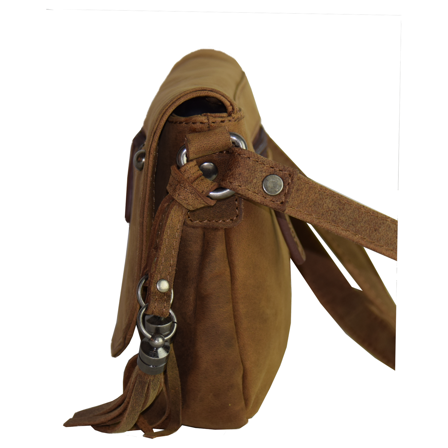 Adjustable shoulder strap, bag closed with flap and snap Front: 1 pocket closed with zipper Inside: 1 pocket closed with zipper, 1 open pocket Back: 1 pocket closed with zipper |