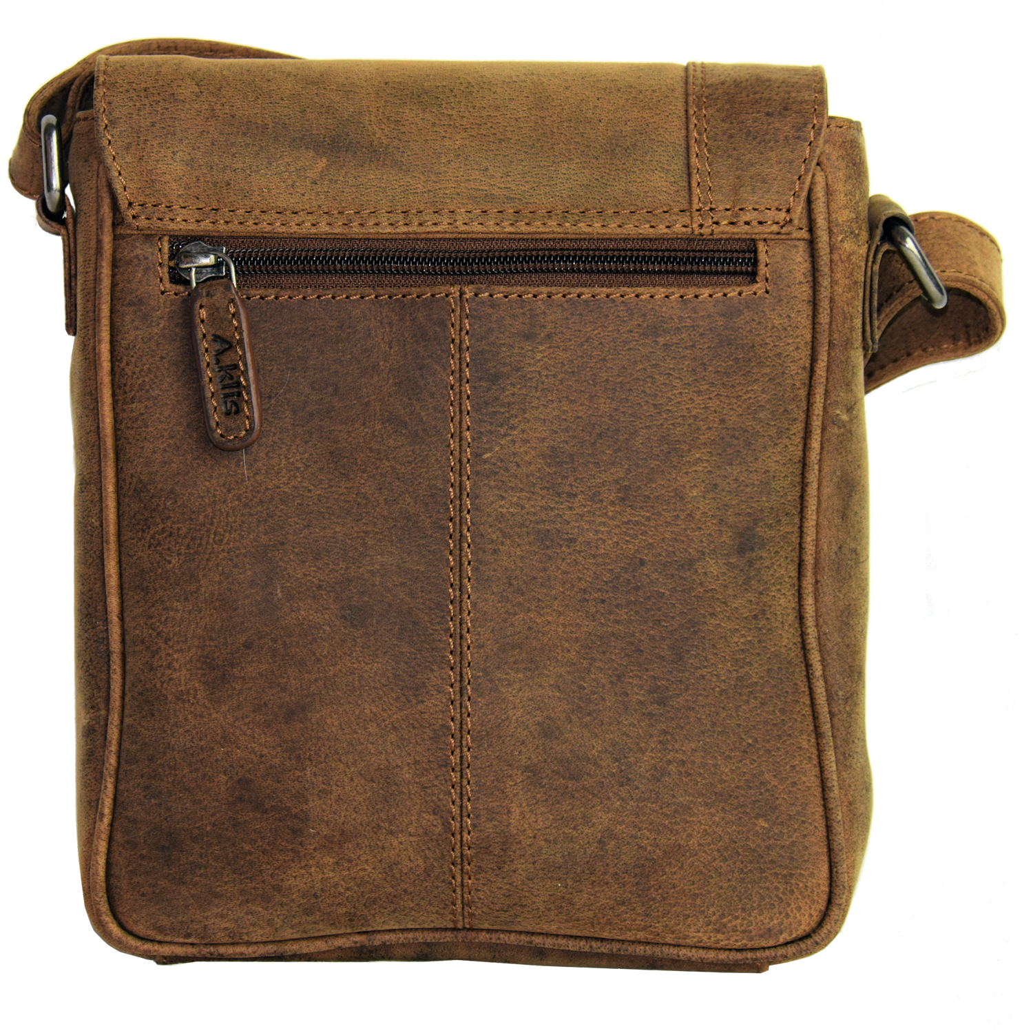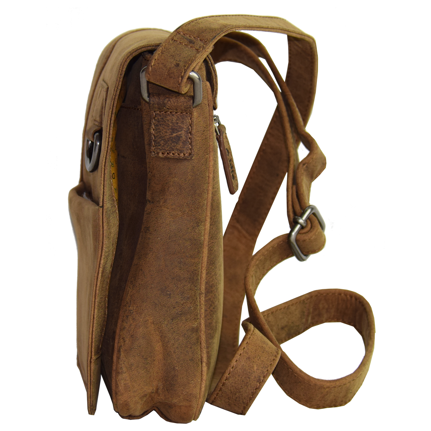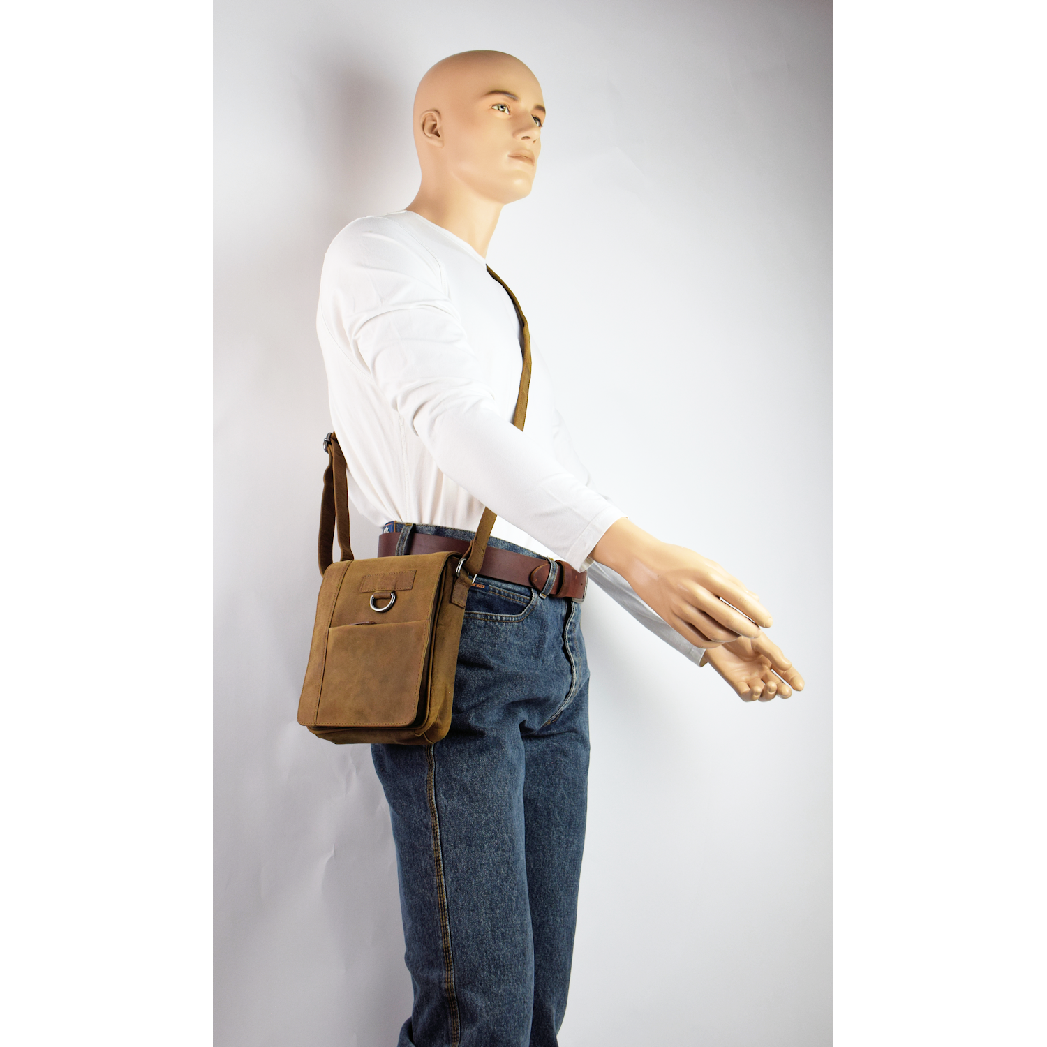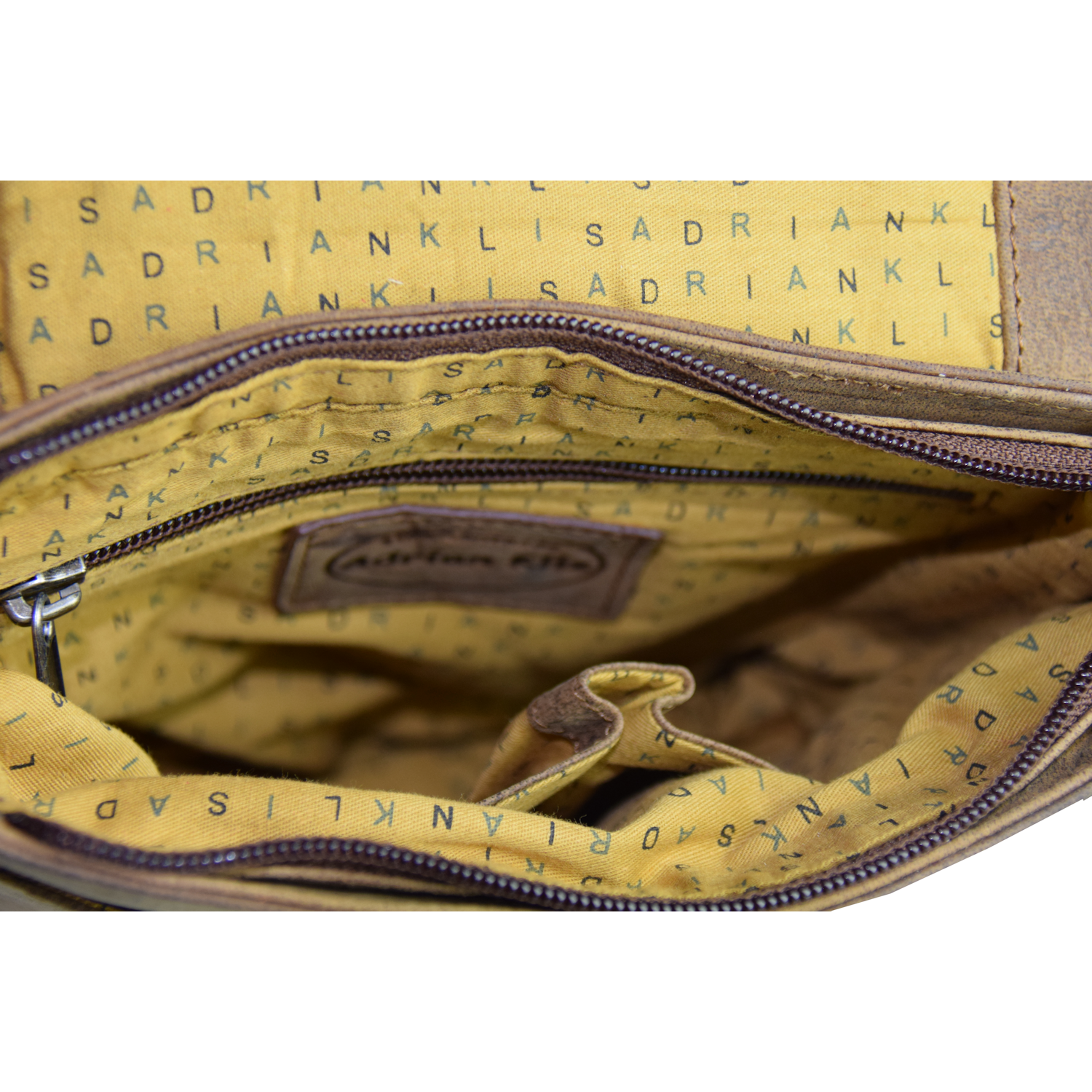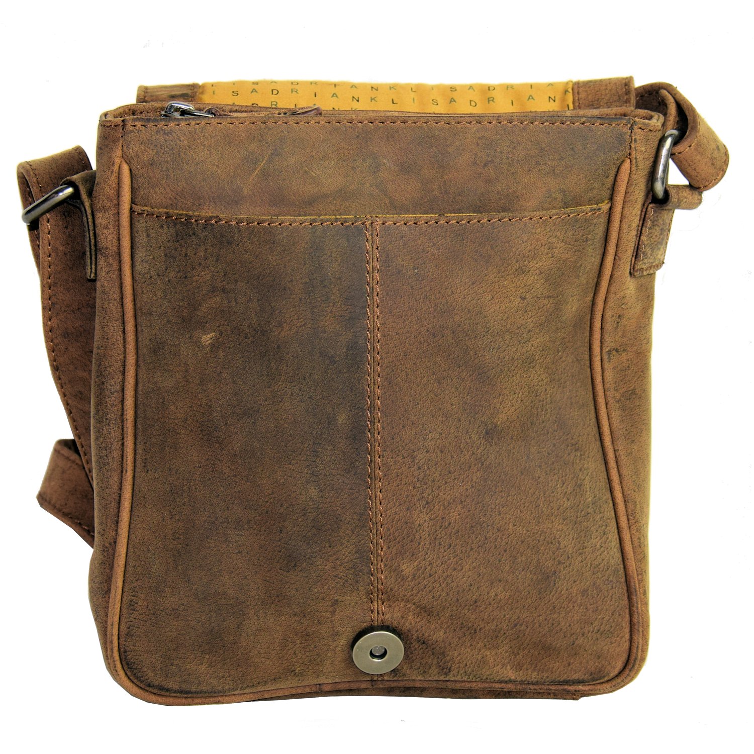 Adjustable shoulder strap, bag closed with flap and snap Front: 1 open pocket, 1 key ring Front open: 1 open pocket Inside: 1 pocket closed with zipper, 1 open pocket Back: 1 pocket closed with zipper |