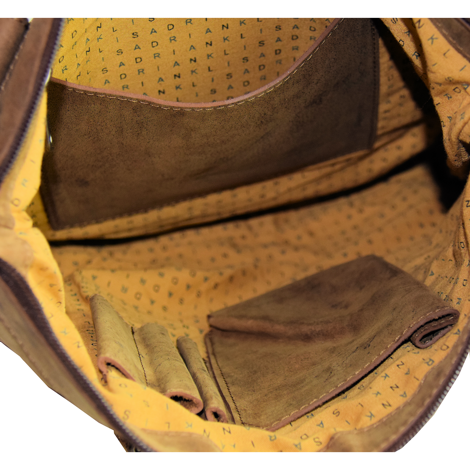 Description: | adjustable shoulder strap, bag is closed with zipper, Front: 2 pockets closed with zipper, Back: 1 pocket closed with zipper, Inside: 1 pocket closed with zipper, 1 open pocket, 1 cell phone pocket |