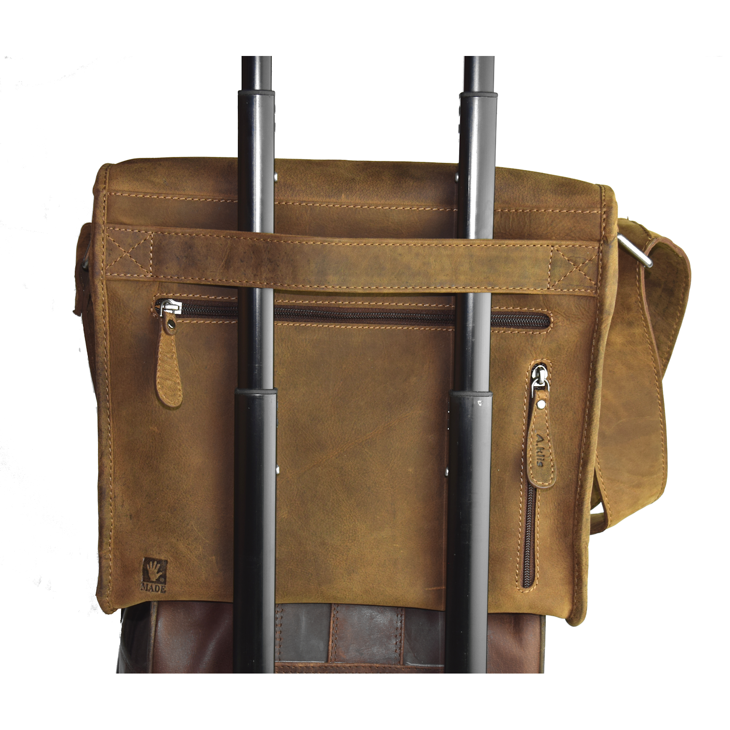Description: | adjustable shoulder strap, bag is closed with 2 snaps Front: 1 pocket closed with zipper on front flap, Back: 2 pockets closed with zipper, 1 handle for trolley Inside: 1 pocket with zipper, 1 cell phone pocket, 1 open pocket, 2 pen holder |