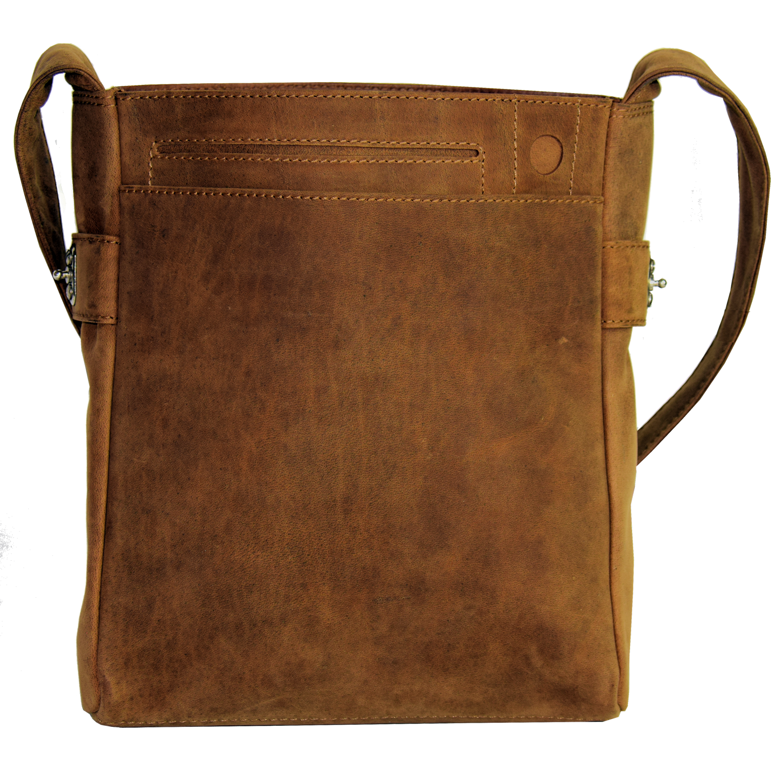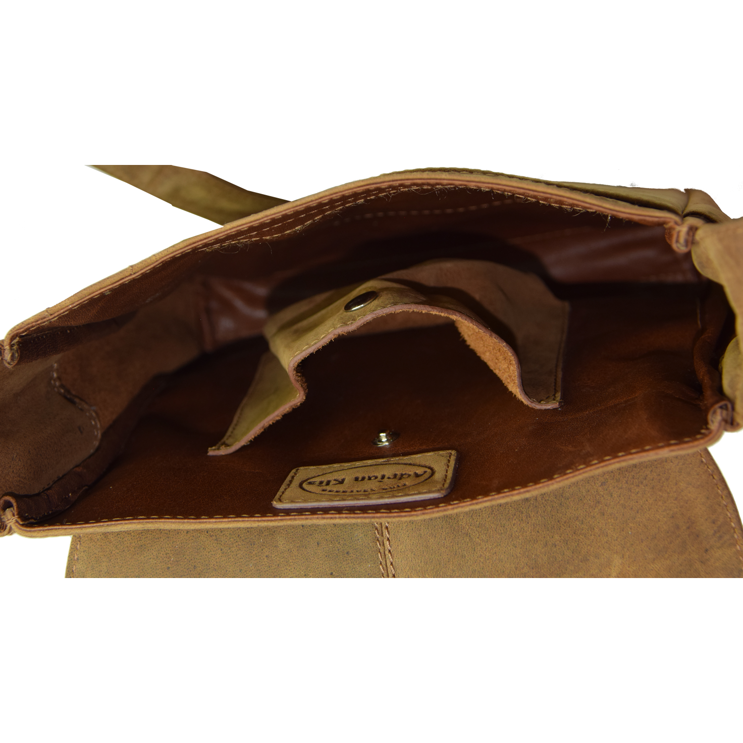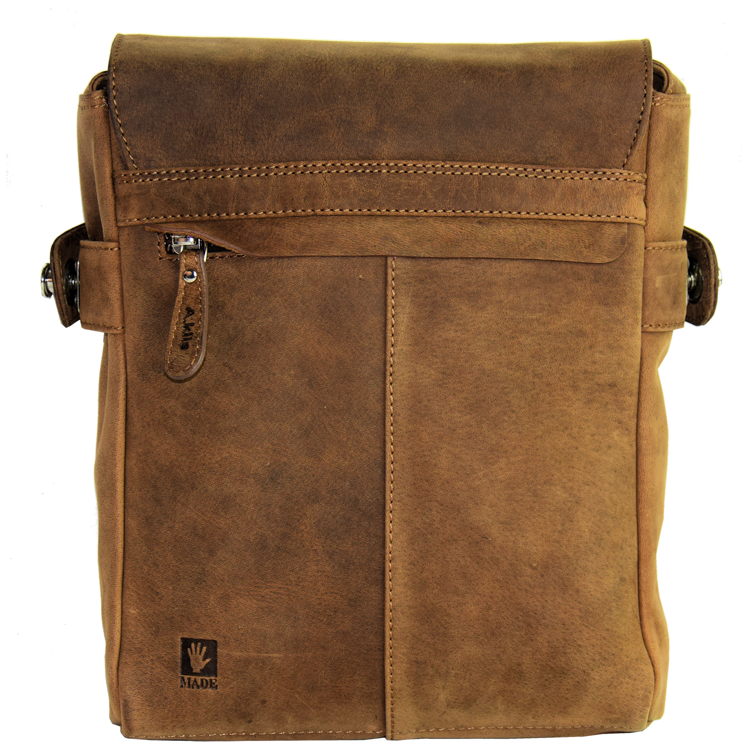 Description: | adjustable shoulder strap Bag is closed with flap and 2 locks Front open: 2 open pockets, 1 pen holder pocket Back: 1 pocket closed with zipper 1 Main compartment, cell phone pocket inside closed with snap, leather lining |