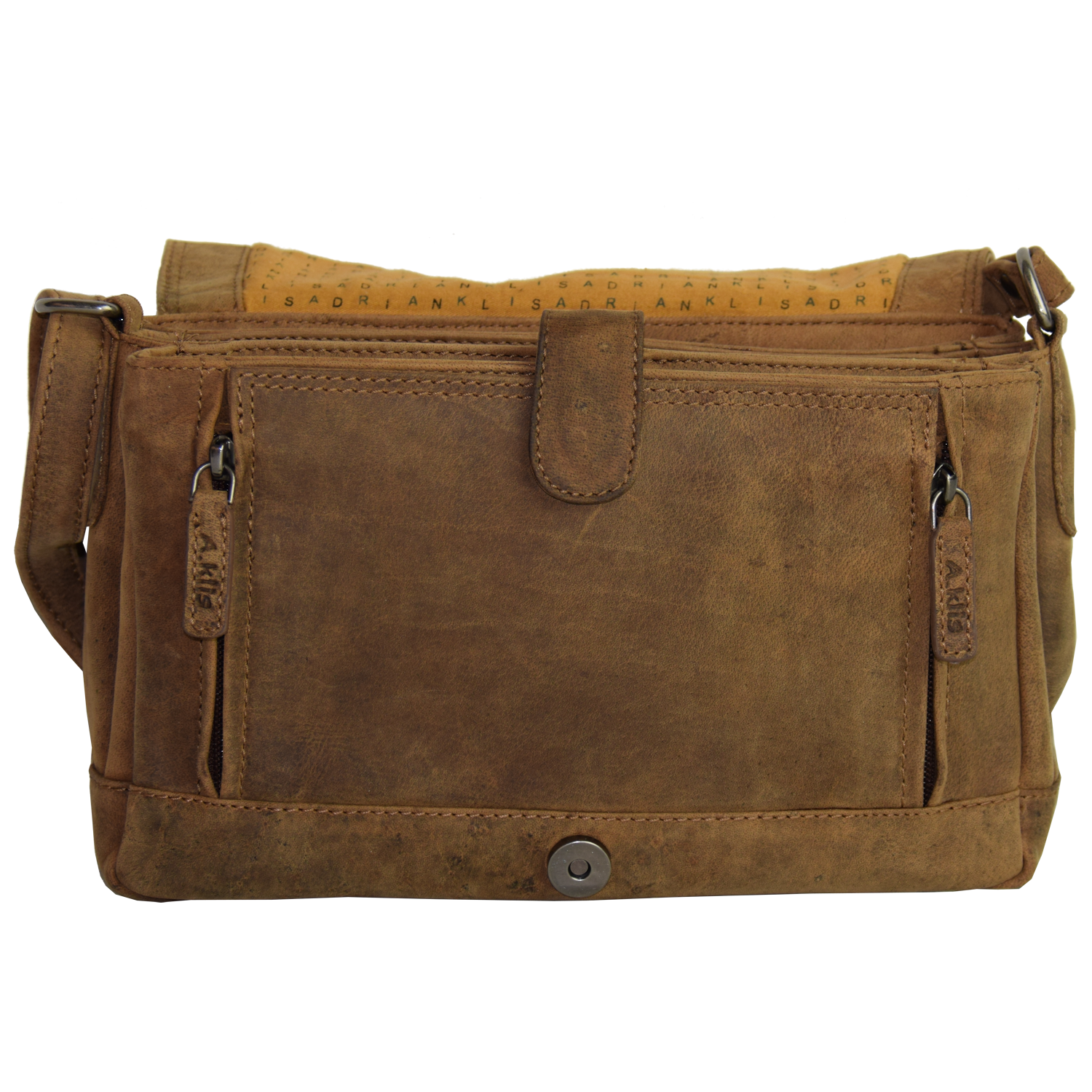 Description: | Organizer is closed with flap and snap, Adjustable shoulder strap Front open: 1 pocket closed with 2 zipper, 1 pocket closed with Velcro strip, 3 CC slots and 2 open pockets inside Back: 1 pocket closed with zipper Main Compartment Inside: 3 pockets, 2 pockets closed with zipper |