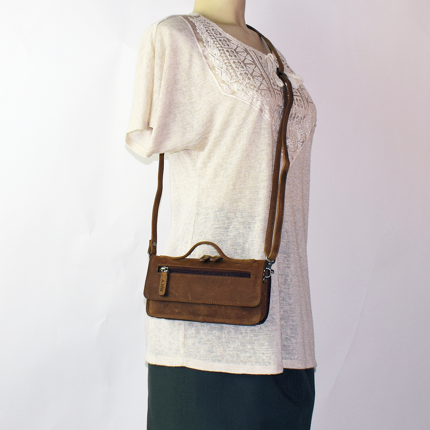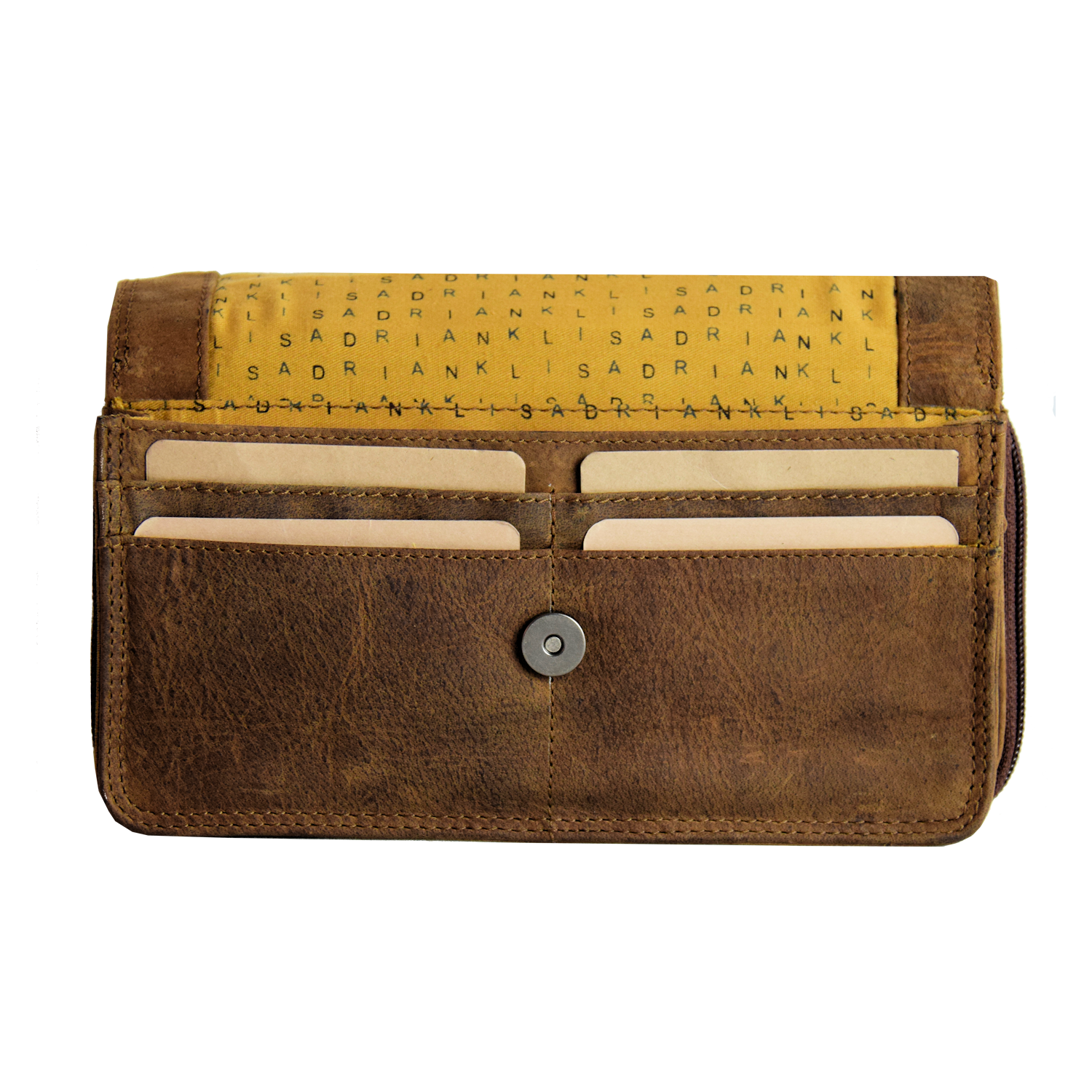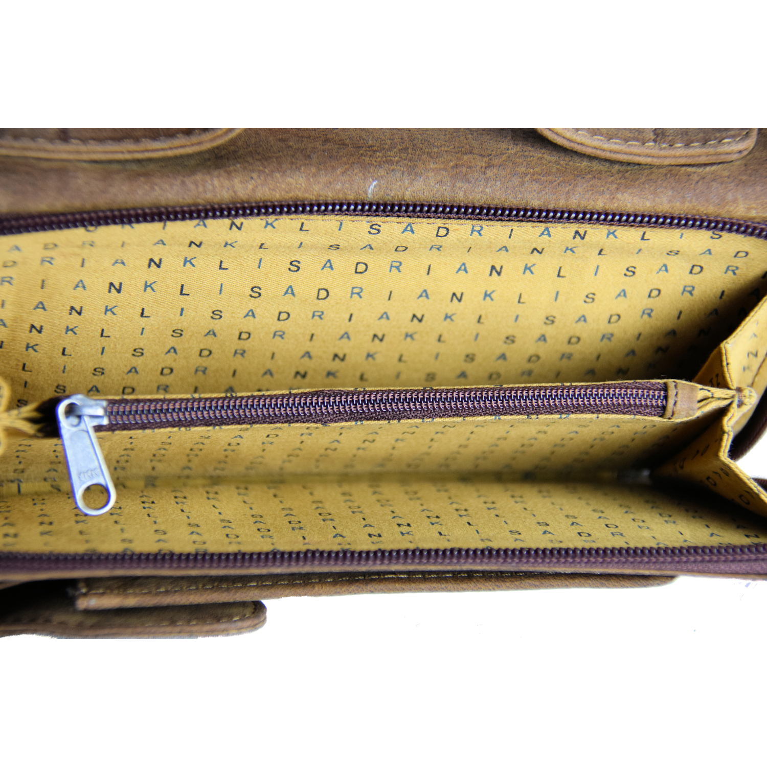 Organizer is closed with flap and snap, 1 handle Adjustable shoulder strap Front: 1 pocket closed with zipper Front open: 4 CC slots, 1 Compartment Inside: 1 open pocket, 1 pocket closed with zipper Back: 1 cell phone pocket closed with flap