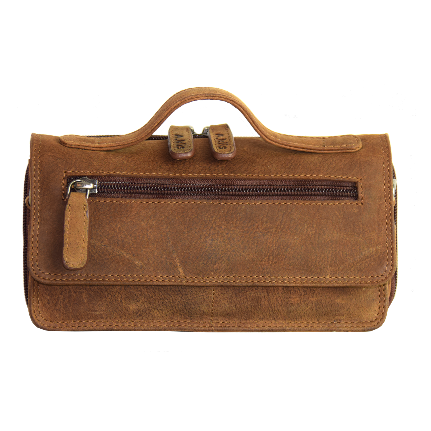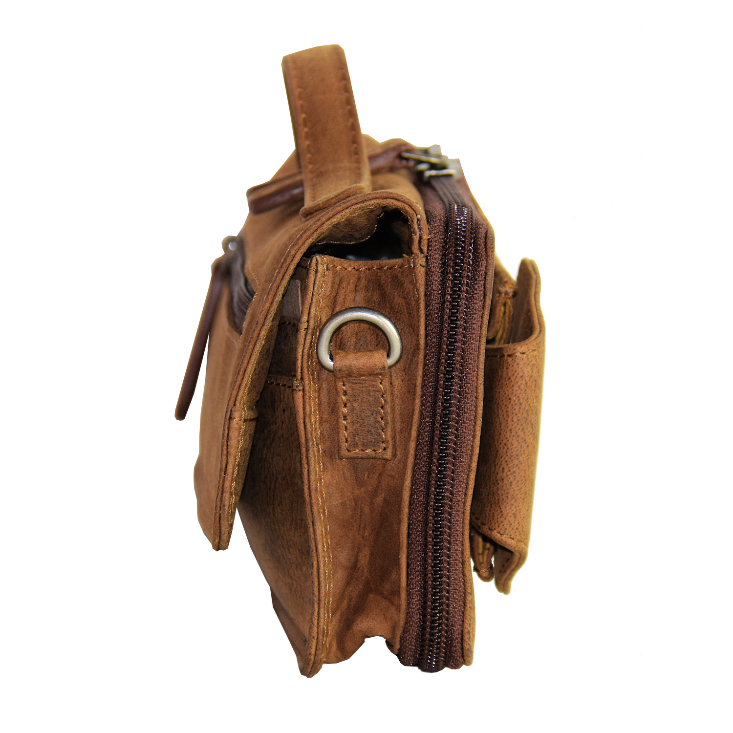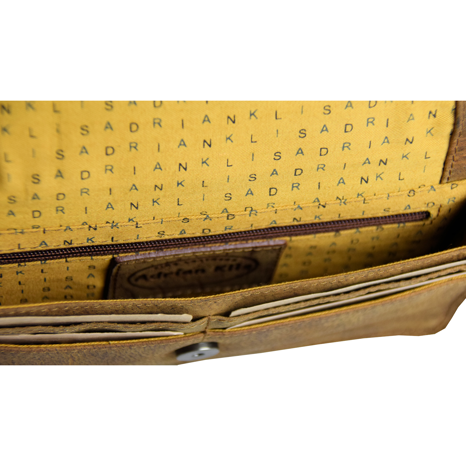 Organizer is closed with flap and snap, 1 handle Adjustable shoulder strap Front: 1 pocket closed with zipper Front open: 4 CC slots, 1 Compartment Inside: 1 open pocket, 1 pocket closed with zipper Back: 1 cell phone pocket closed with flap