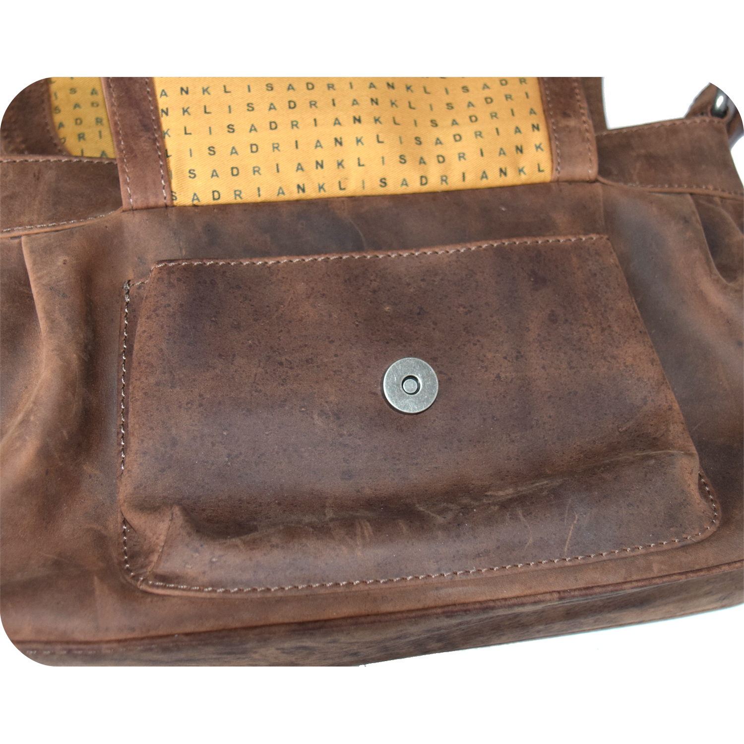 1 adjustable removable handle, 1 removable adjustable shoulder strap Purse is closed with 2 magnetic snaps Front inside: 1 pocket closed with magnetic snap Back: 1 pocket closed with zipper Inside: 3 compartments Comp. I inside: open with 2 open pockets Comp. II: closed with zipper Comp. III inside: open with 1 pocket closed with zipper |