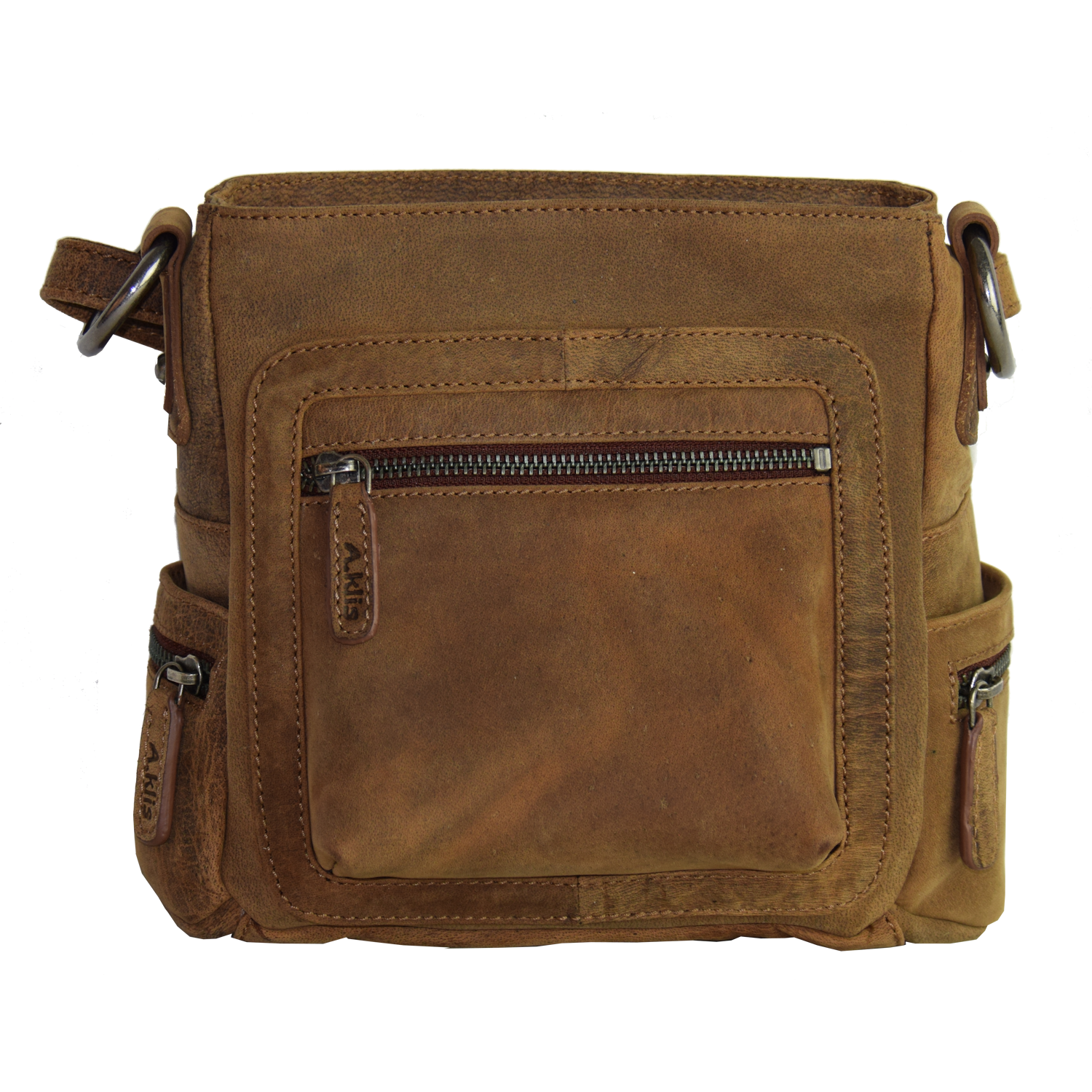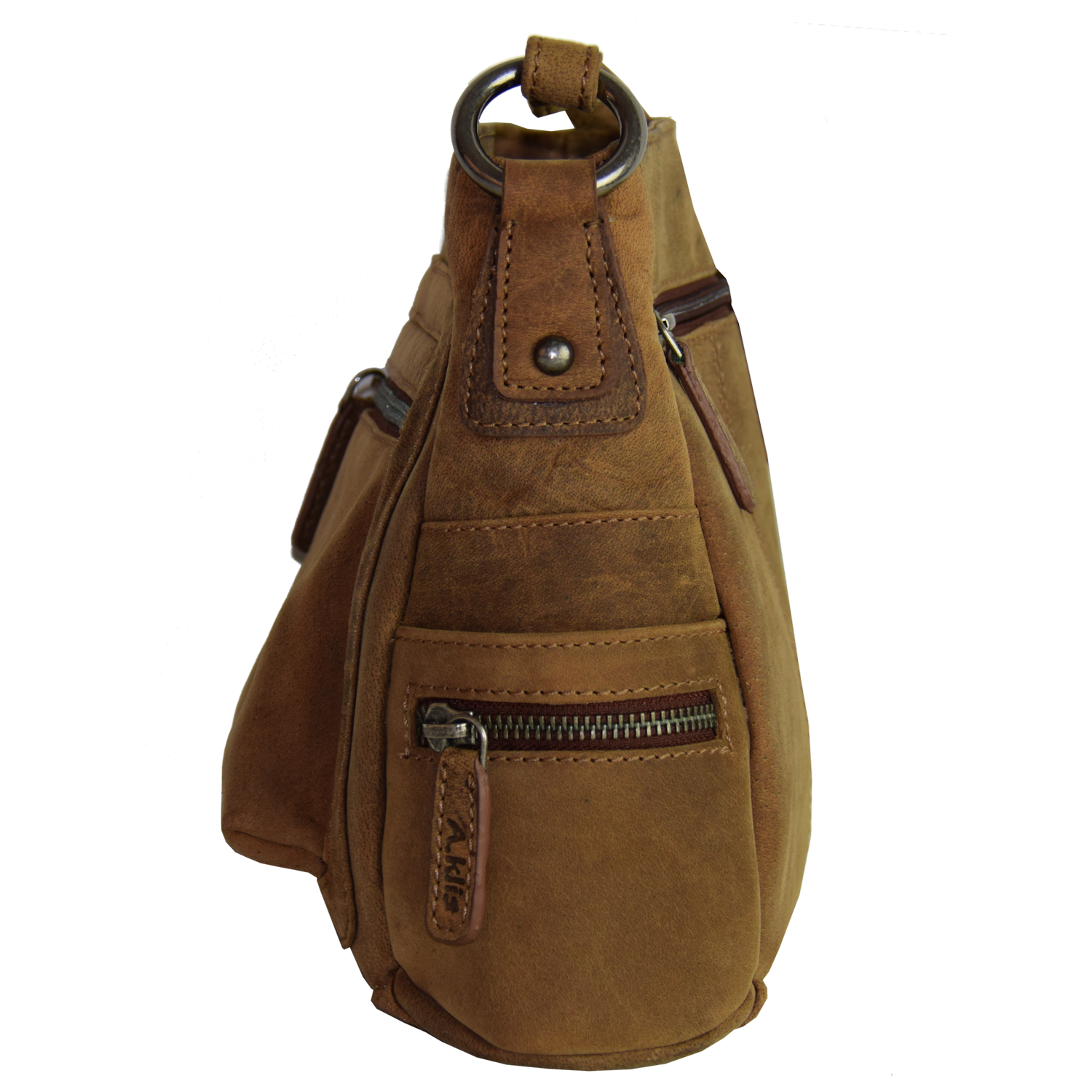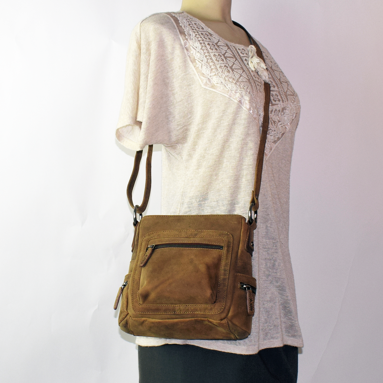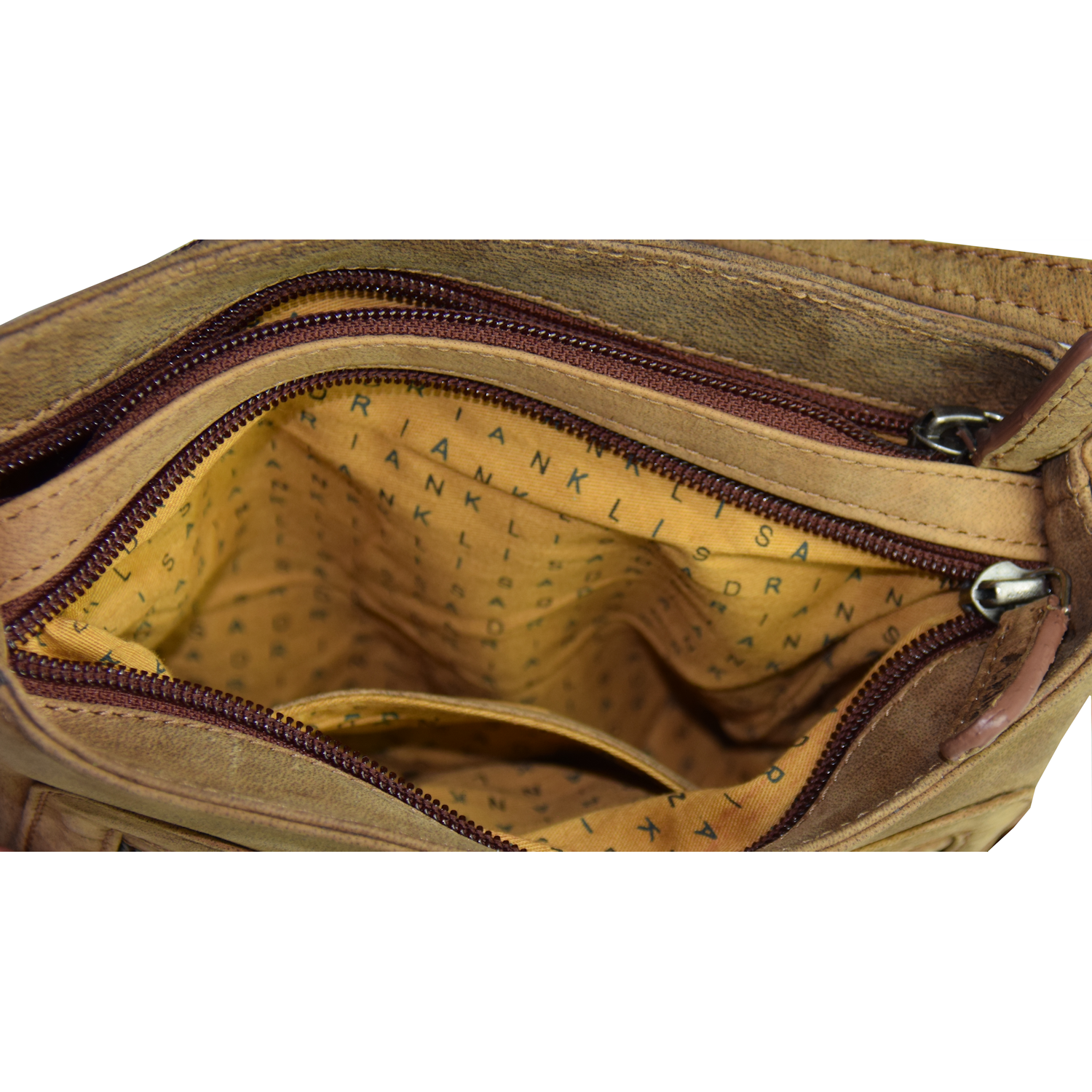 adjustable shoulder strap, Purse closed with 2 zipper Front: 1 pocket closed with zipper Back: 1 pocket closed with zipper Each side: 1 open pocket, 1 pocket closed with zipper 2 compartments each closed with zipper: Comp. I inside: 1 cell phone pocket Comp. II inside: 1 pocket closed with zipper |