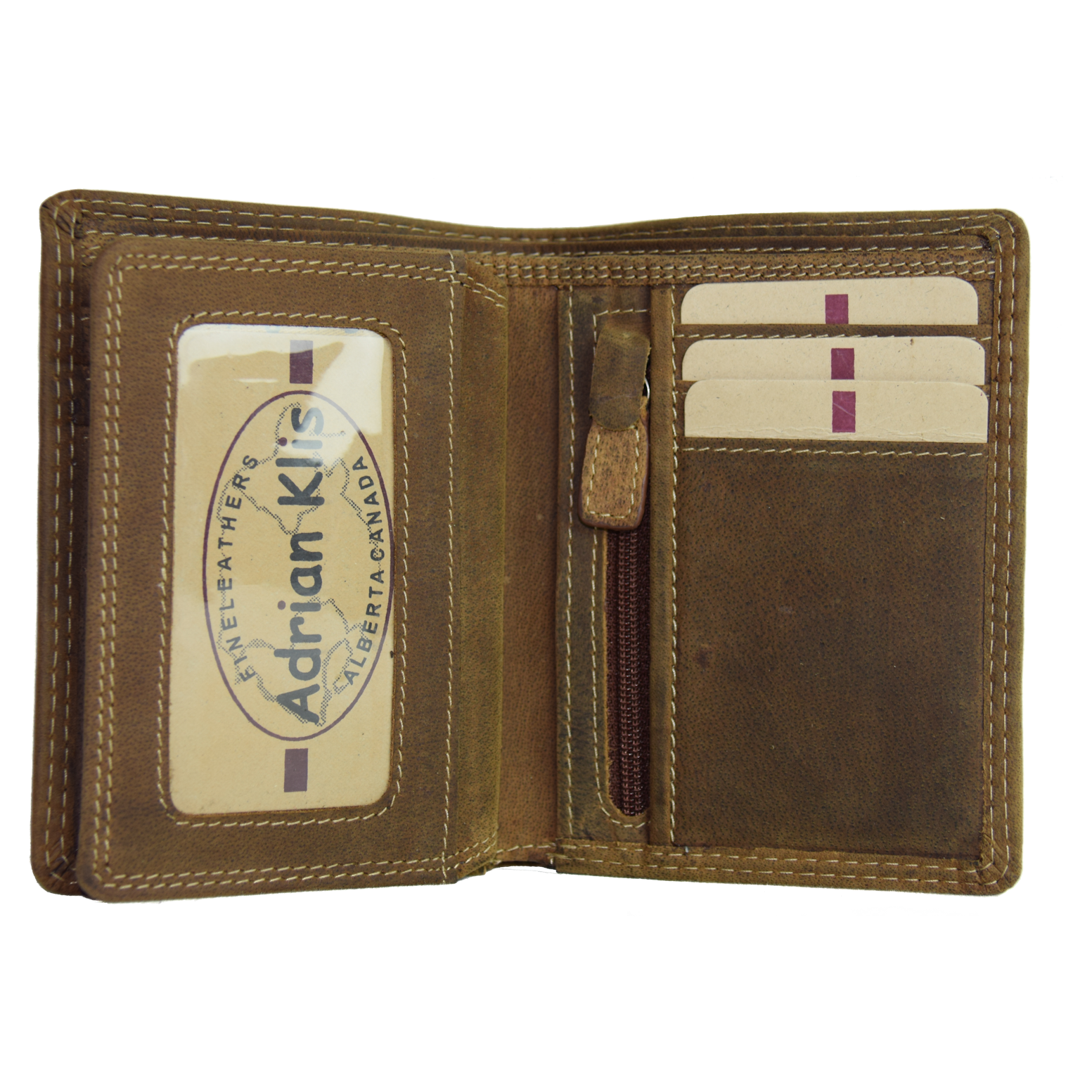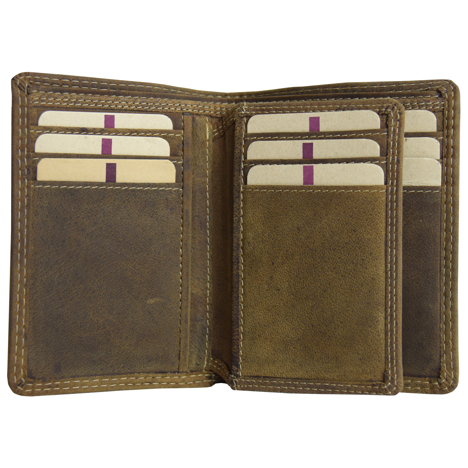 2 bill pockets, 9 CC, 2 pockets, 1 ID, zipper inside |