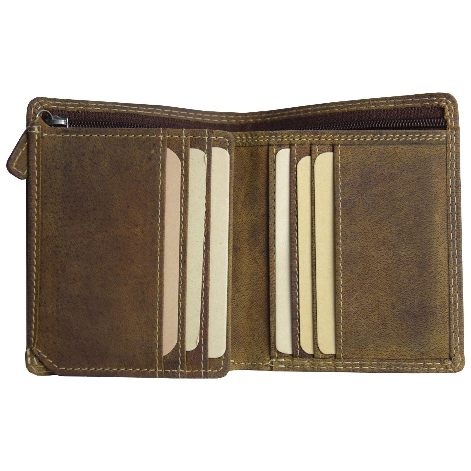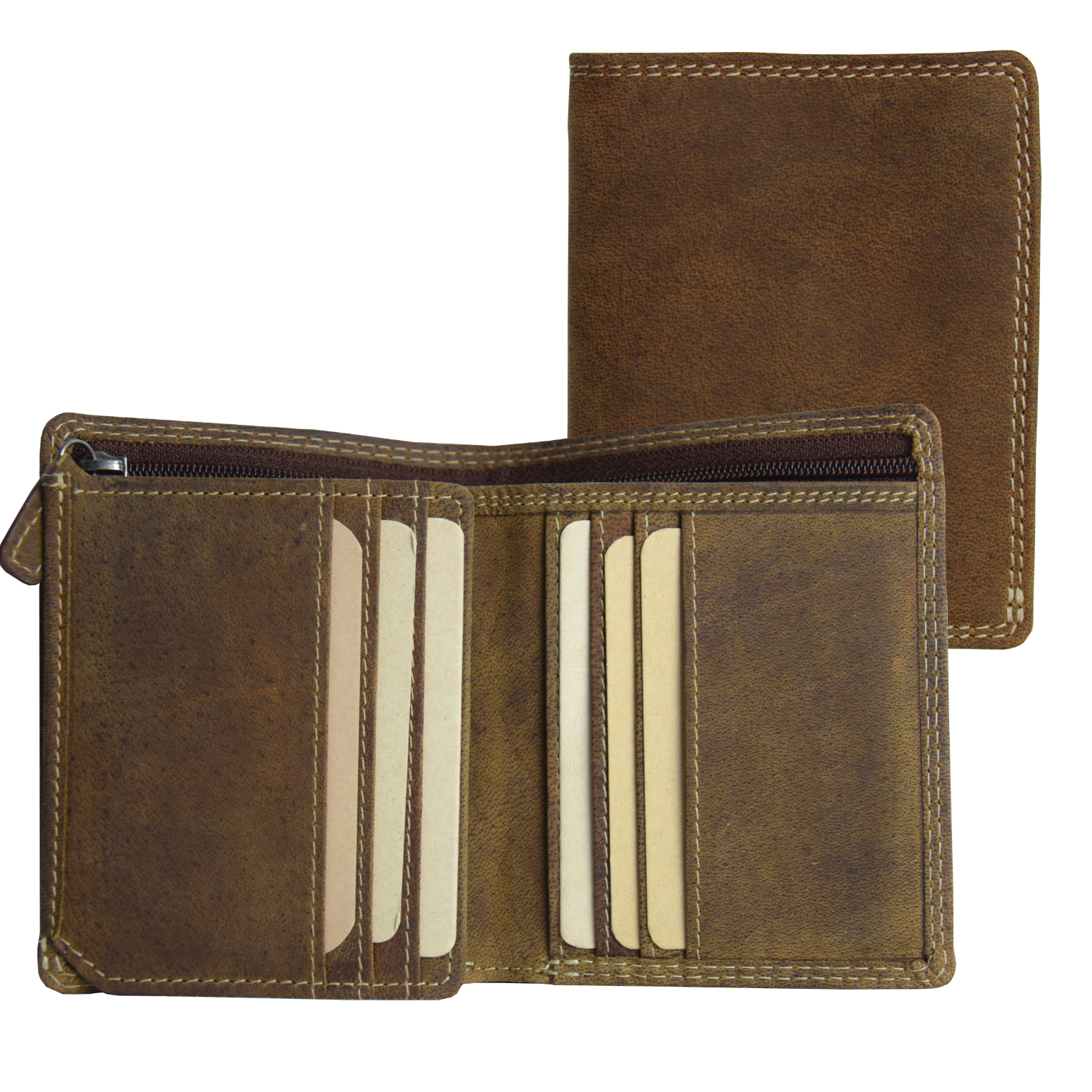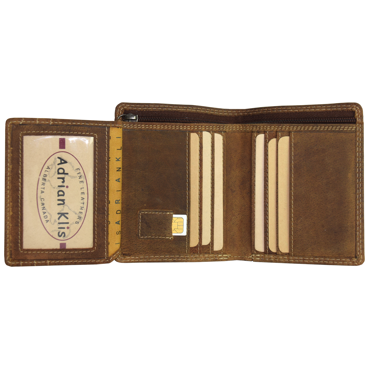 Front and back are identical 1 flap with 3 CC, 1 ID Inside: 6 CC, 1 smart card pocket, 3 open pockets, 1 pocket closed with zipper
